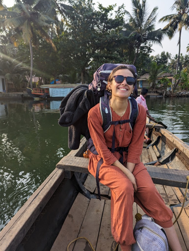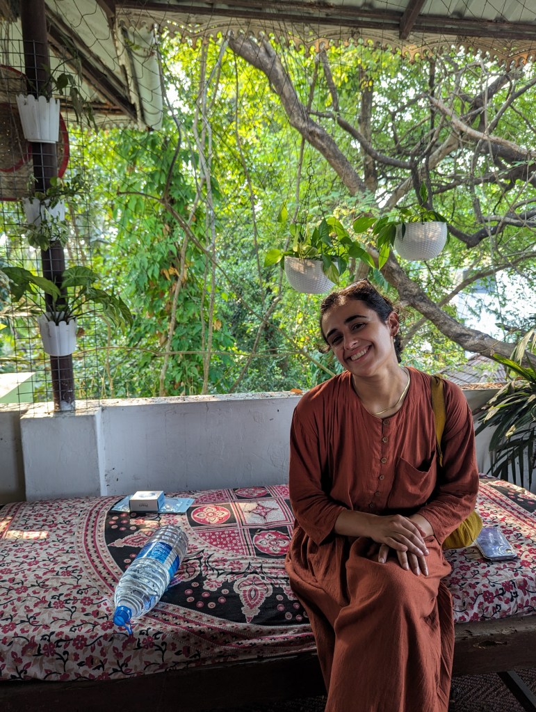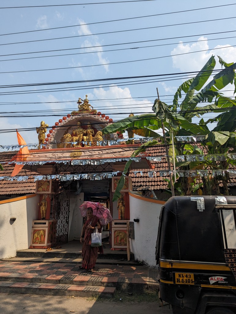 We were up relatively early, though not yoga school early, for our departure from Munroe Island to Kochi. Our train left at 8.40 from a station across the river on the mainland to the north, so we ate breakfast before the rest of the guests and were escorted to the river bank by Vijeesh’s sister (Vijeesh was on a early morning canoe tour) where the ferry would take us across and a rickshaw was waiting for us on the opposite bank.