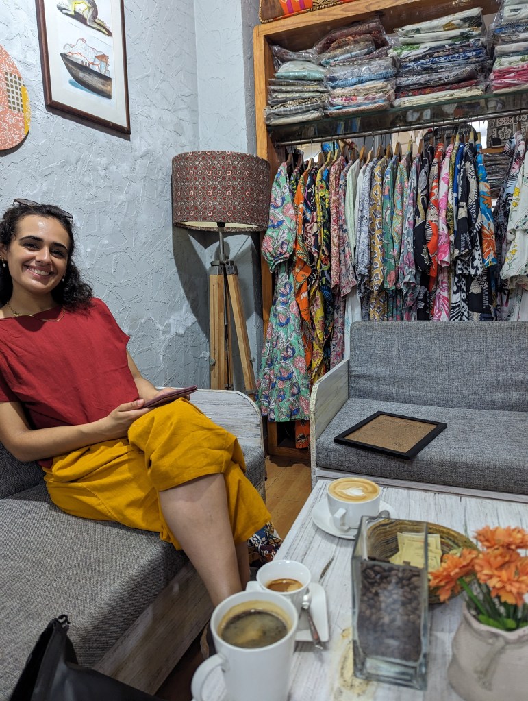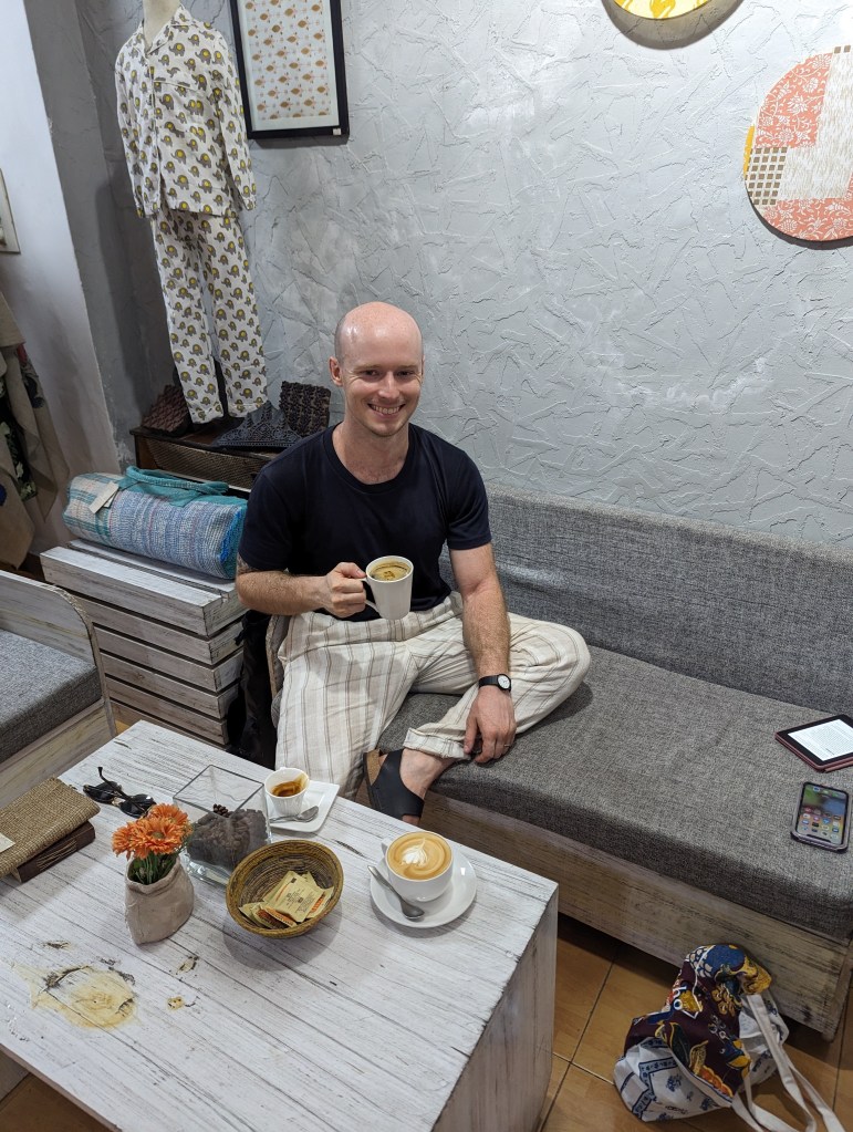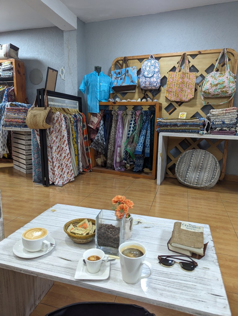 After the tour we went back for breakfast which was served on the roof of the homestay, then out again for another coffee at another cafe. Thus revitalised, the rest of the morning we spent in the clothes shops around the district. By now, we have learnt which clothes work well in the heat and which clothes don’t, and so we updated our travelling wardrobe accordingly. We ended the morning in a local art gallery which had a cafe in the garden serving delicious, if not authentic, food.