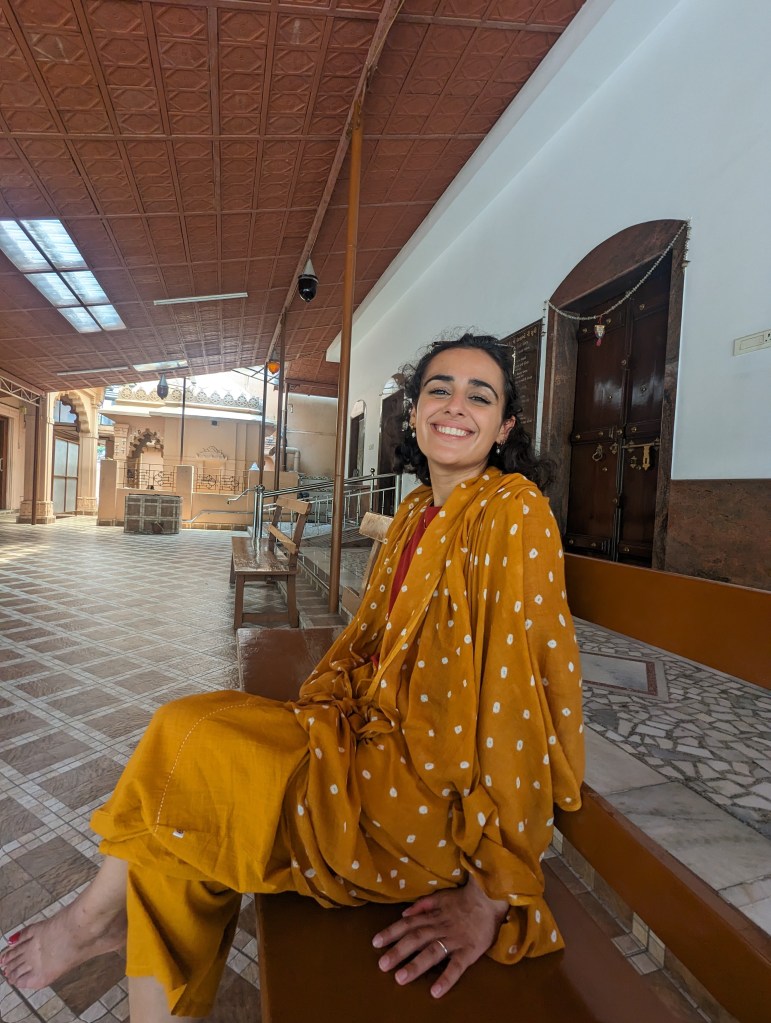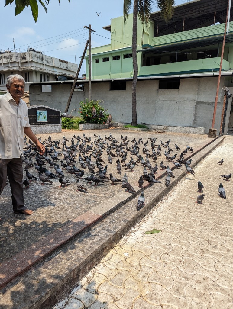 A little further down the road we reached Jew Town and ducked into a cafe/clothes shop for the obligatory mid-morning coffee. We sat at a little table in the middle of the quiet shop and had probably the best coffee of the trip to date. Buoyed by both lassi and coffee, we headed back out into the heat of the day. We walked 20 or so uncomfortable minutes to a local Jain temple where they made a show of feeding the local pigeons at midday each day. We were shown around the temple complex, which still liberally uses the swastika as a religious symbol, then given a handful of grain each to feed the pigeons with. Ellie thought better of it, but I joined the middle-aged women also there assembled in letting the pigeons eat from my hands.