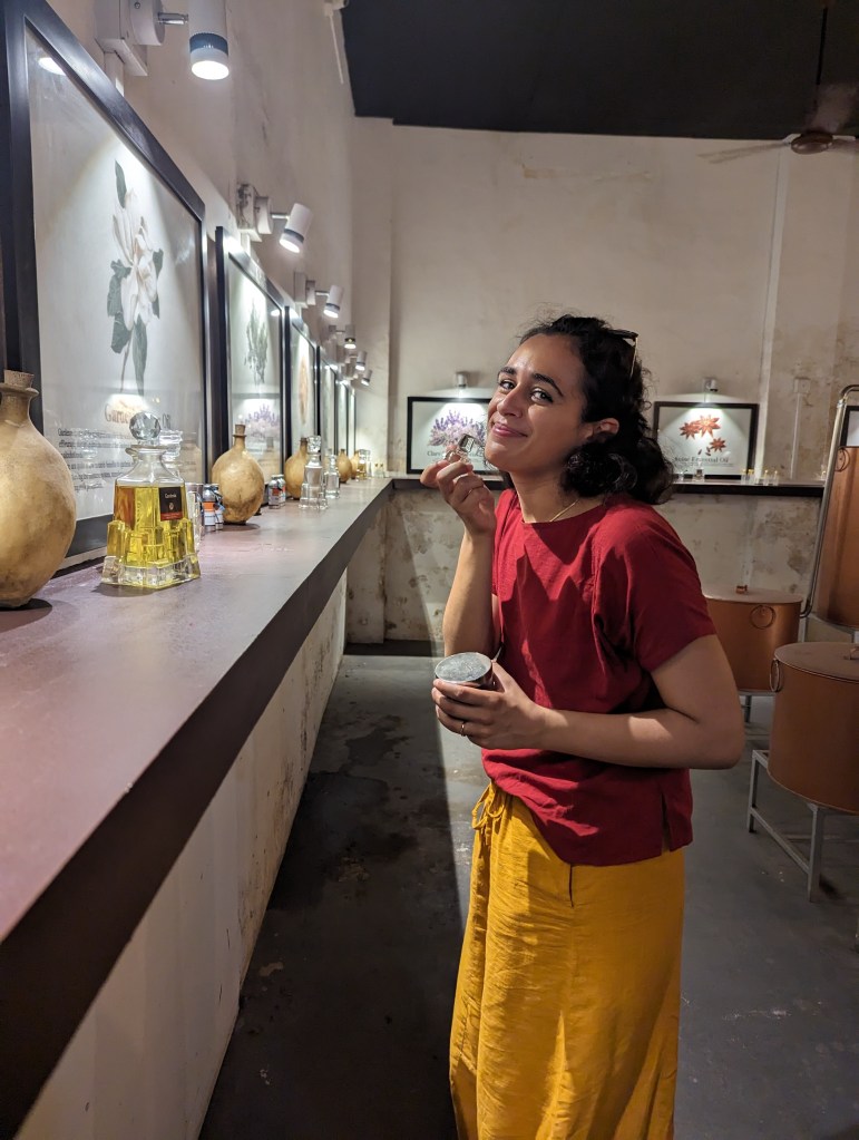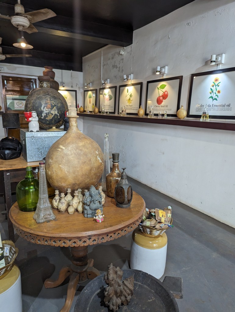 We ate lunch in a local cafe, then walked to the “SPR perfume museum” just down the road. In actual fact, the museum was a huge shop with at least 100 or so essential oils of pretty much every imaginable fragrance. Here the owner, a very kindly Indian lady in her 50s, patiently watched us smell each and every one – lime, white rose, red lotus, sandlewood, vetiver, rosemary, girardinia, oudh wood, jasmine to name a very few – before advising some combinations for us to try and bottling them up for us.