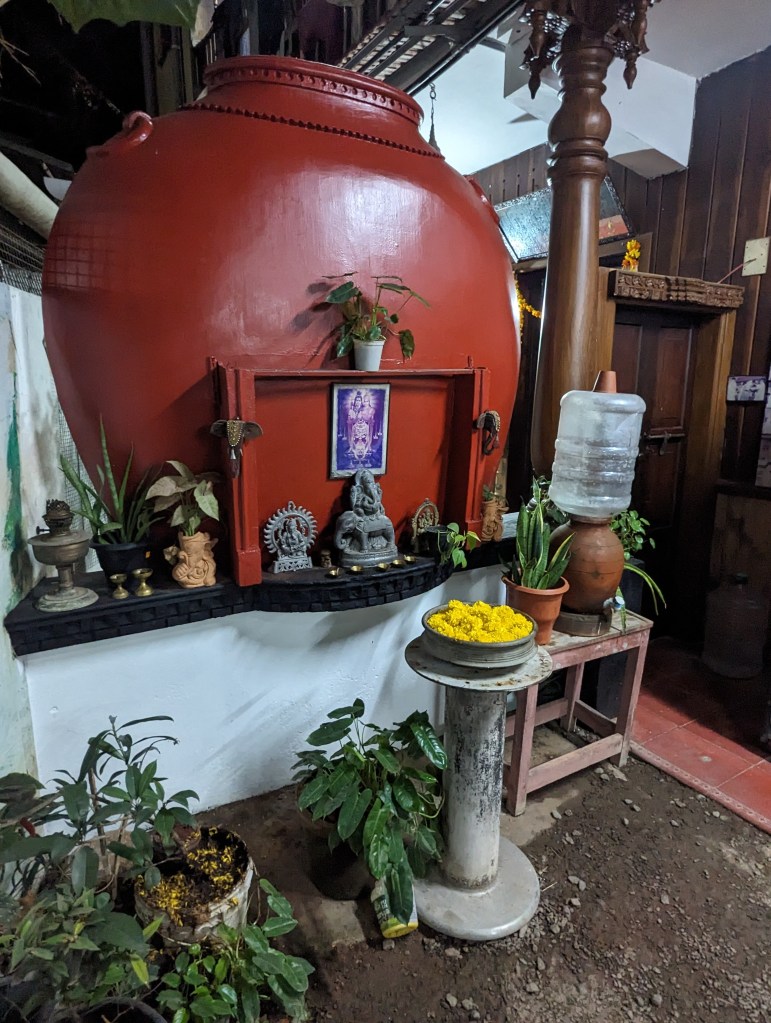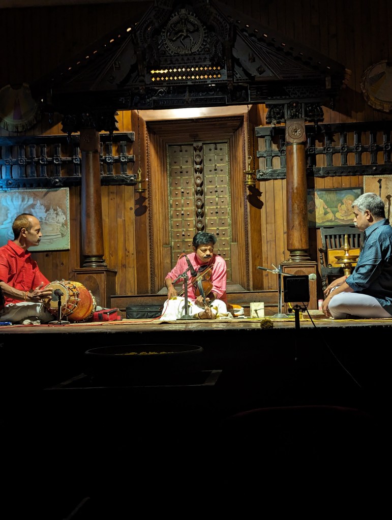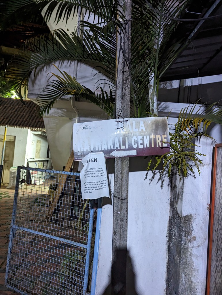We and our spoils rickshawed (a verb now in our common parlance) home where we spent an hour or two to rest, then got ready to head back out into Fort Kochi. The Kerala Kathakali Centre is a small theatre tucked down a sidestreet in the town centre area, and every night has shows of Keralan classic art – dance, plays, music and martial arts. We opted this night to go to the classical music performance. We were 2 of maybe 7 or 8 in the audience. The performers were three men sat cross-legged on the stage, one playing a violin in Indian style with the scroll pressed into the top of his foot, the other two on drums.