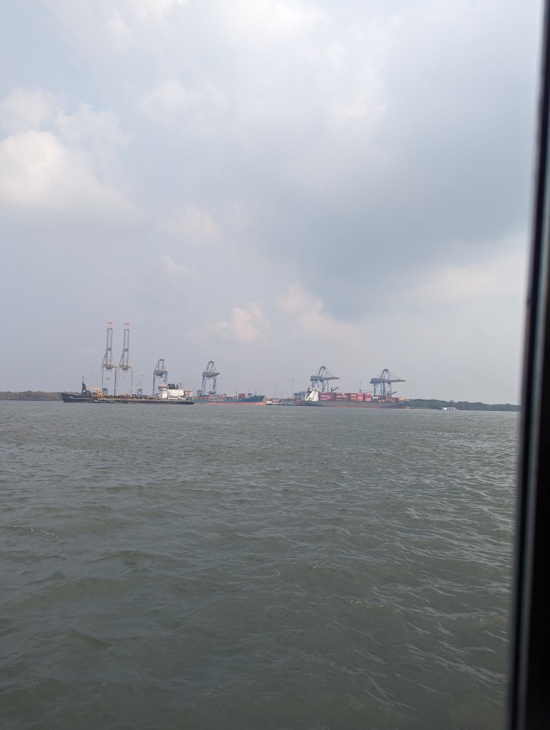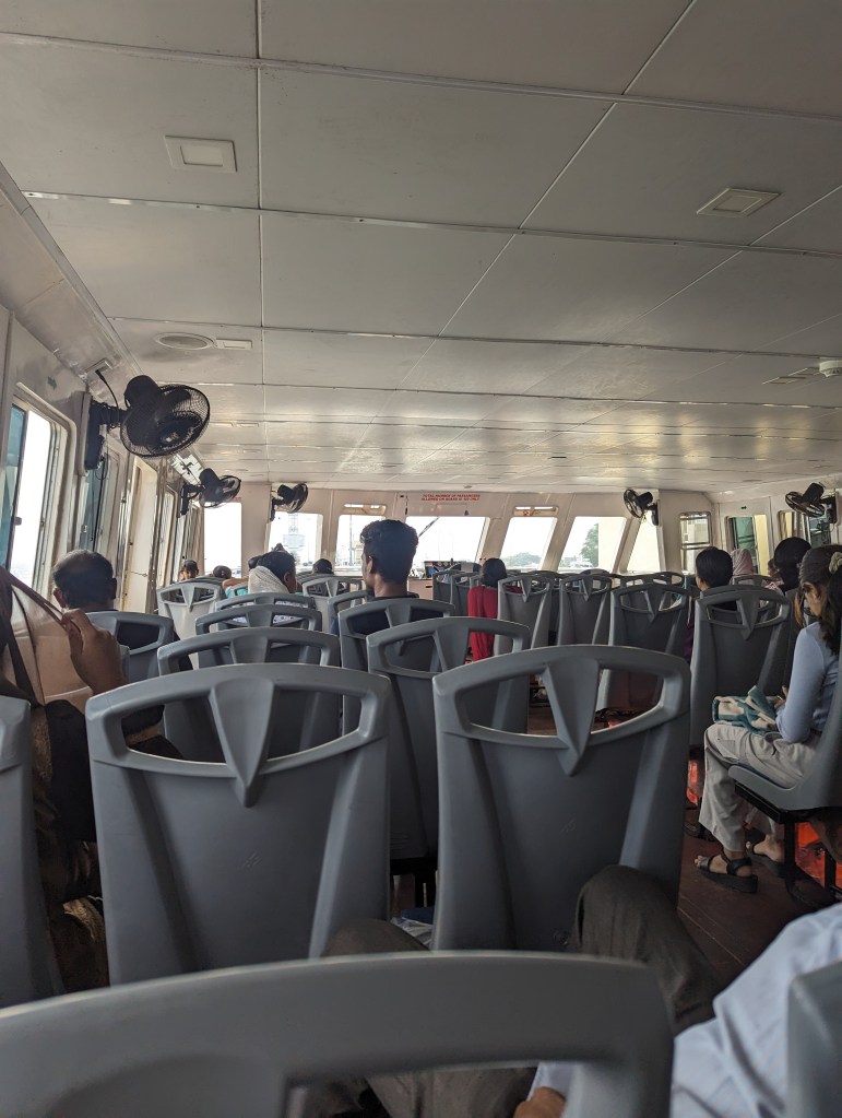 After breakfast, we walked up into Fort Kochi for a coffee and mango lassi in one of the cafes before heading to the ferry port to catch the shuttle ferry into Ernakulam on the opposite bank. The ferry ticket was about 20/- (20p) each, and it drew up almost as soon as we arrived, and set off as quickly. The ferry took us across the busy shipping and naval harbour to the jetty for the mainland city of Ernakulam.