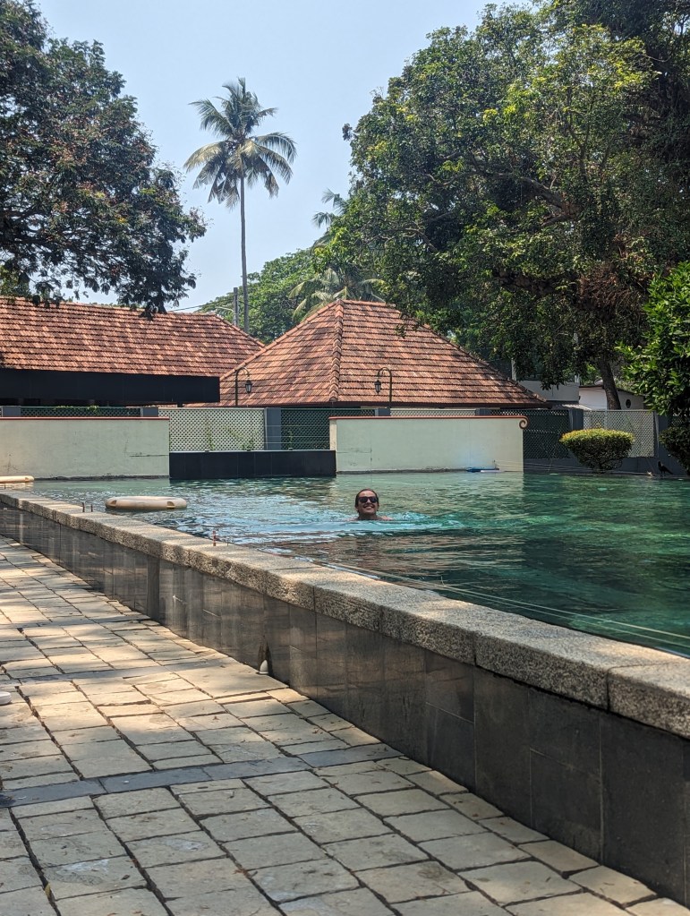 By Saturday we felt that we had done the Fort Kochi area pretty well, so spent most of the day revisiting some of our favourite cafes and other spots around the town. After coffee from the best cafe we had found, we headed to the pool in the Cochin Club to spend another couple of hours in the water and reading by the poolside. We were joined by an Indian family, the son of whom had just come back from a university exchange year at Kingston University, and had recently accepted a job as a tea-taster in Kochi.