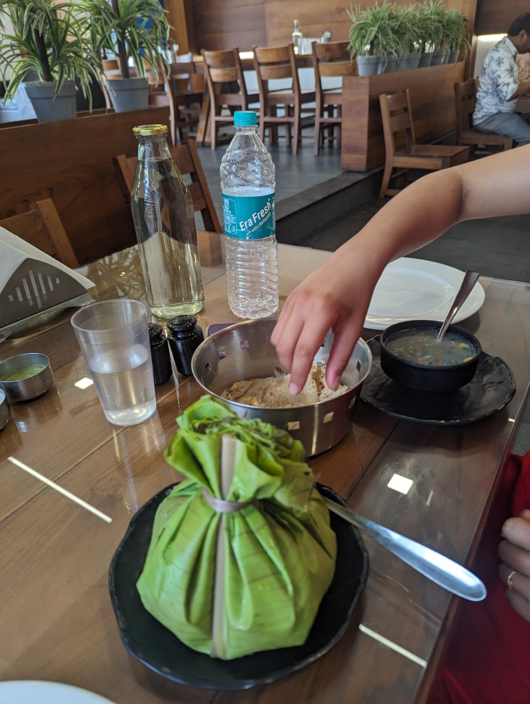 We found a “multi-cuisine” restaurant, which usually means South and North Indian food, and ordered. I had a biriyani which came wrapped in banana leaf and has been something of a staple for me in restaurants of unknown quality since arriving in India. Ellie, wisely, had the sweetcorn soup given we were due to be having dinner back at The Shade in just a couple of hours.