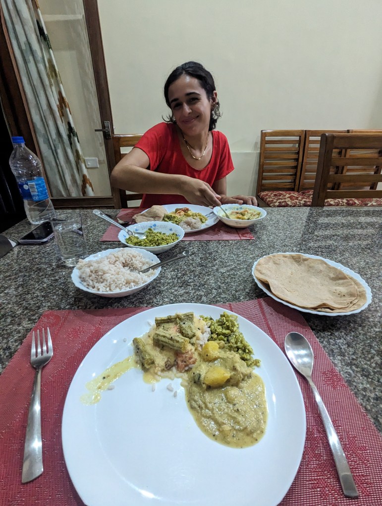 Once home, we unpacked and exercised, then headed up to the dining room for dinner. The nights are beautifully cool, around 20C, compared to what we have been used to. It transpired that, for this night at least, we were the only guests in the homestay and so we had the dining table to ourselves. Santhosh served us the usual array of curries, breads and rice and agreed with us a rough outline of the next few days.