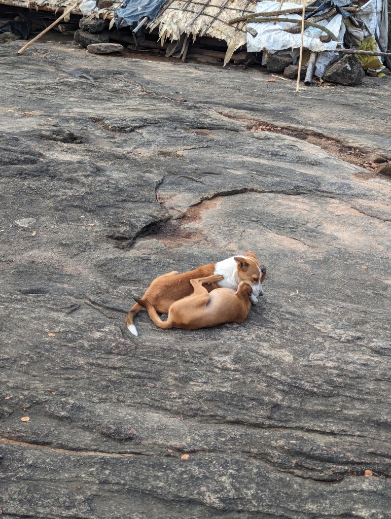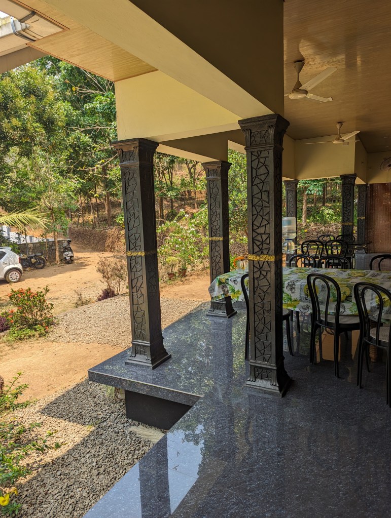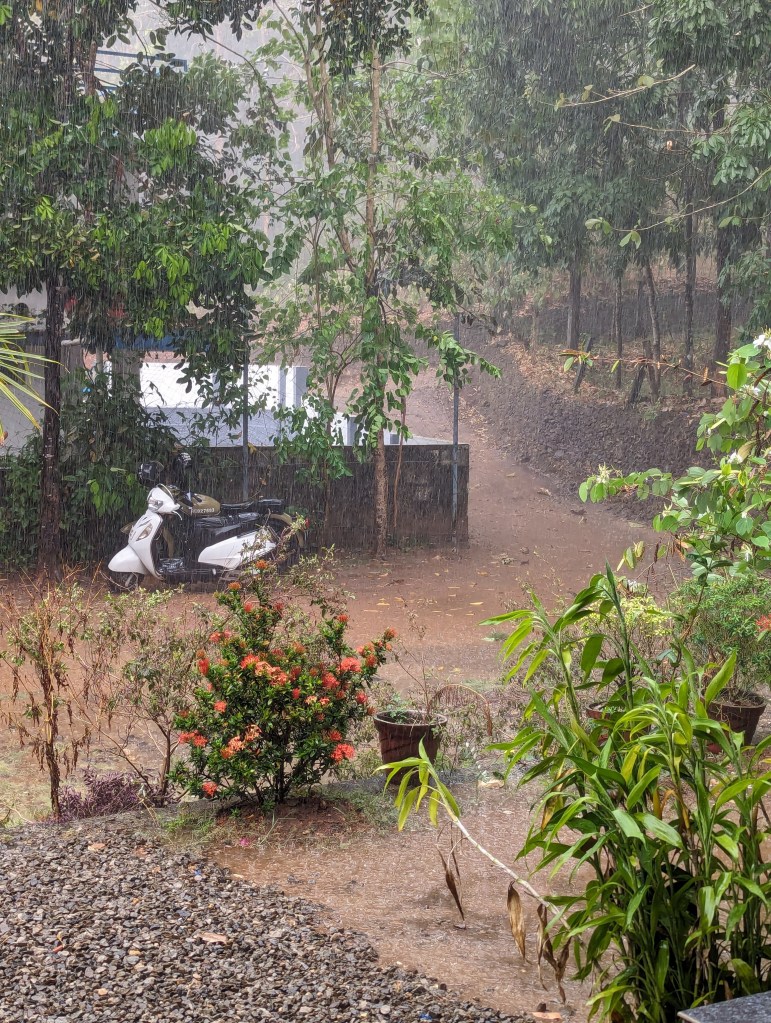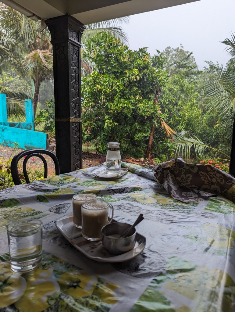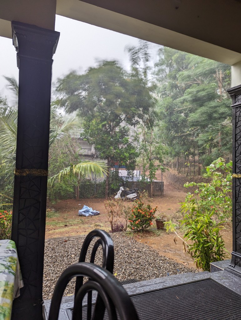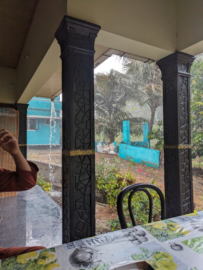 As we unpacked, the clouds outside began to gather and the wind picked up. After a little while, we got the first proper experience of the pre-monsoon rains that sometimes fall over Kerala in the hot season, bar the time we heard them overnight in Kochi. The heavens truly opened and the thunder was nearly continuous for a time. We sat out on the verandah which had just about enough cover to watch without us getting soaked. To our disbelief and despite our protests, Vinod’s daughter and mother kept venturing out under an umbrella from the main house to bring us sweet, milky coffee and snacks.