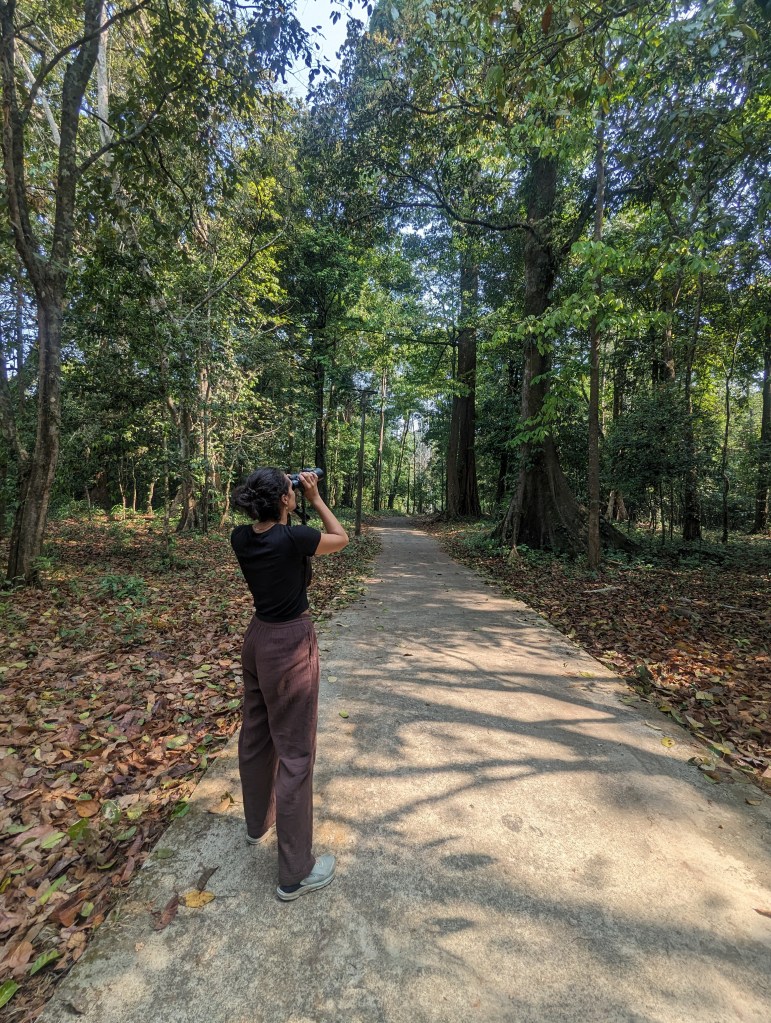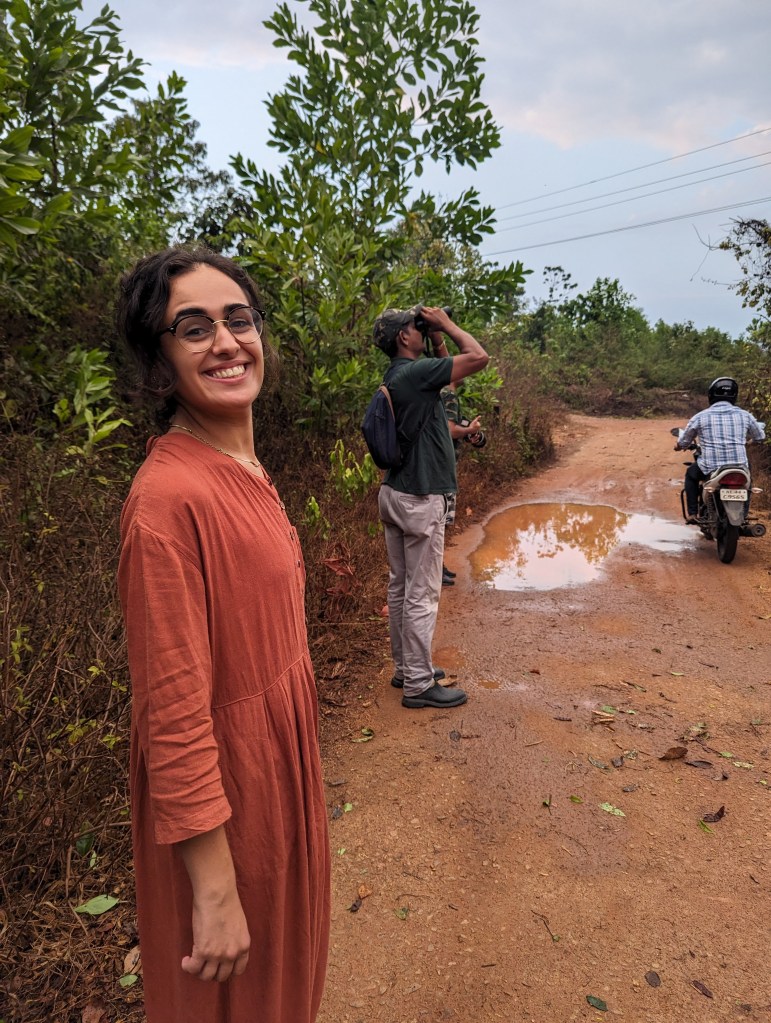 Once the rains cleared, we got ready for our first taste of real birding. We set out in Vinod’s car with a bird photography enthusiast from Chennai who had taken advantage of the fact his doctor wife was doing a set of night shifts to escape to the bird sanctuary. He was a jolly man who chuckled at everything, called Vinod “sir”, and kept saying things like “luck makes up for all!” when we managed to spot a rare bird. I was very much tickled by the fact that both Vinod and our friend from Chennai had clearly intentionally worn forest green and camoflage clothing whilst I happened to be wearing something similar as well, whereas Ellie had set out in a bright orange jumpsuit and a vivid turquoise rain jacket.