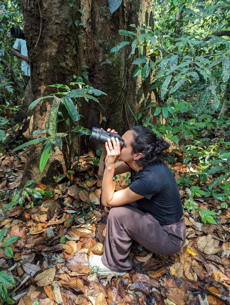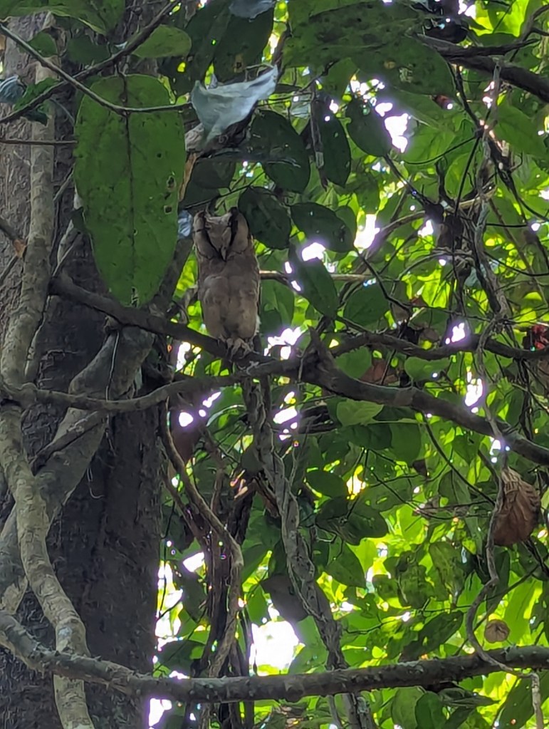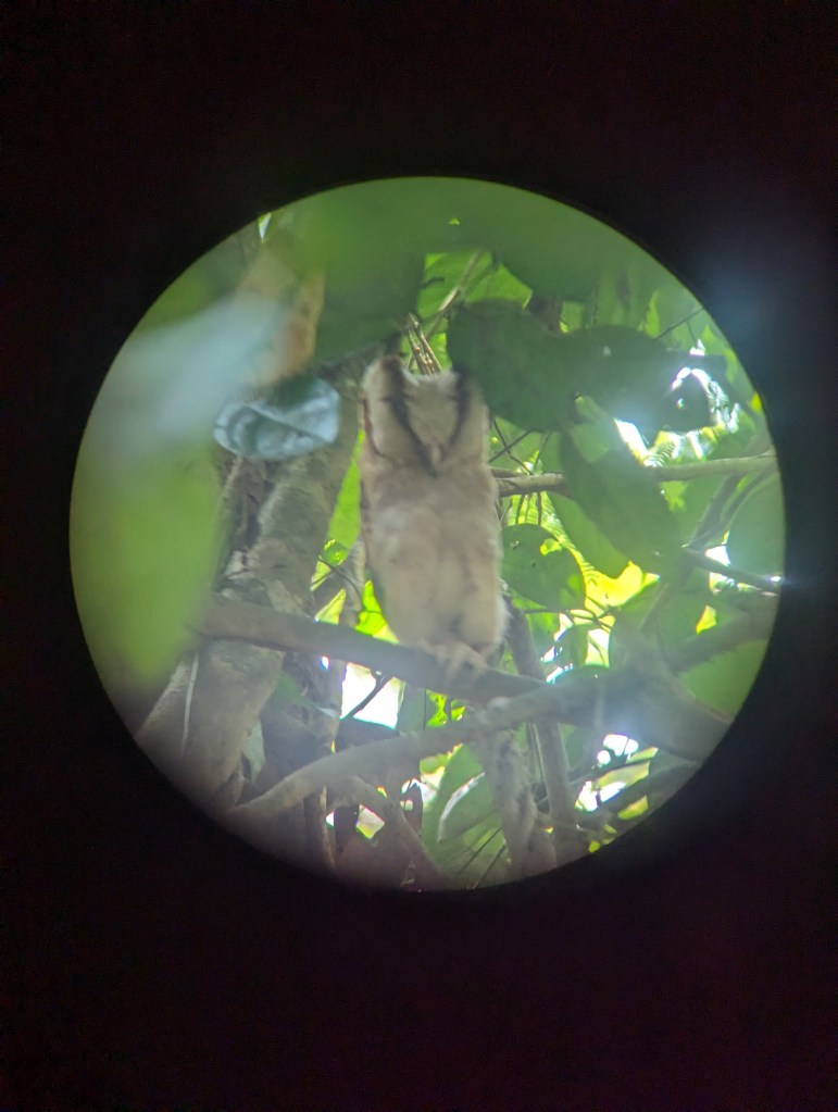 And with that we were racing back to another spot in the jungle to meet us with Vinod’s students. They led us through a jungle path to a tree and pointed up. An owl was perched only a few metres away, apparently asleep. It was indeed a Sri Lankan bay owl, which, we were told, are rare enough that several of Vinod’s students comb areas of the jungle each day looking just for them. Today they had been lucky. Our Chennai friend took at least a thousand photographs whilst we wondered at the magical looking bird sitting quietly up on a branch. It was at this point we discovered that we could just about take a photograph through the lens of the binoculars, which are below.