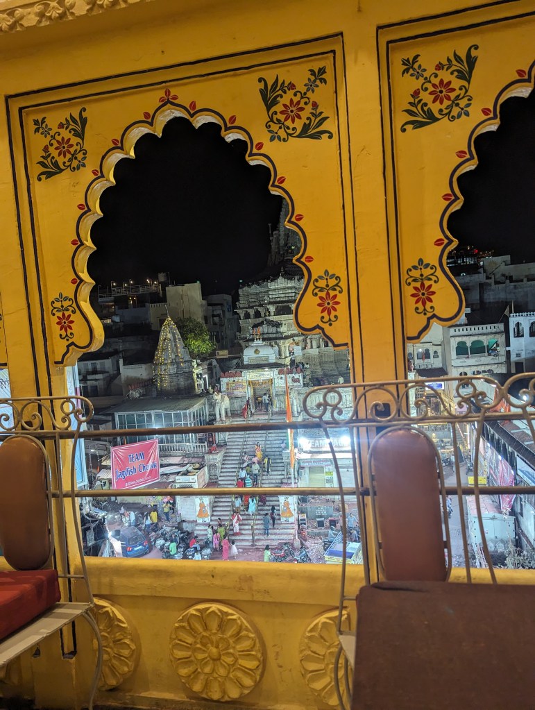 Death thus avoided, we arrived at Hotel Baba Palace at the end of 13 hours of travelling. The hotel is opposite the famous Jagdish palace right in the heart of Udaipur. The hotel manager was friendly but slightly hapless, as the taxi fiasco had suggested to us. We waited for a while for the bellboy in the lobby, then were shown to our suite room on the 3rd floor. The room was passably clean and tidy (this hotel was probably one of the worst rated we are staying in on our trip, so we were feeling a little trepidation of what we might find), with a massive balcony boasting a great view over the temple and its square choked with rickshaws, motorbikes and pedestrians.