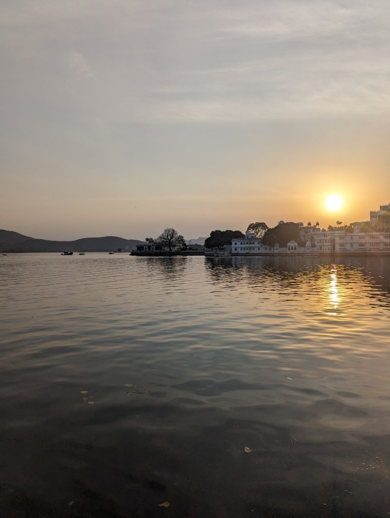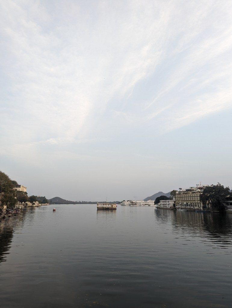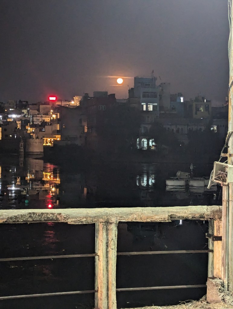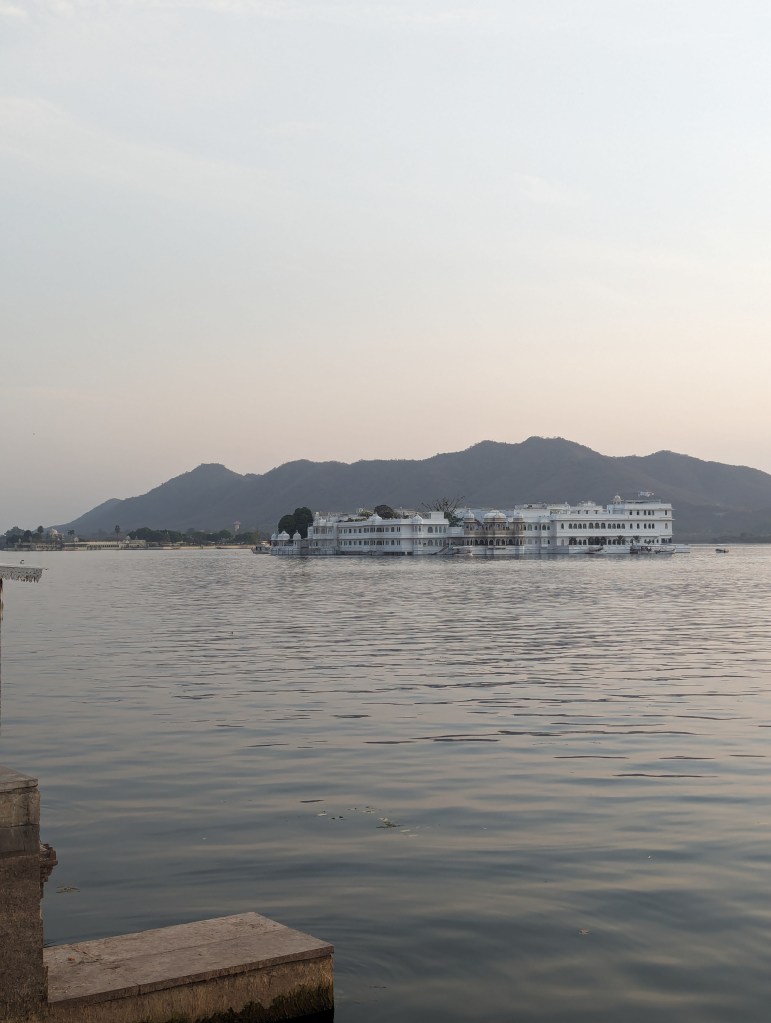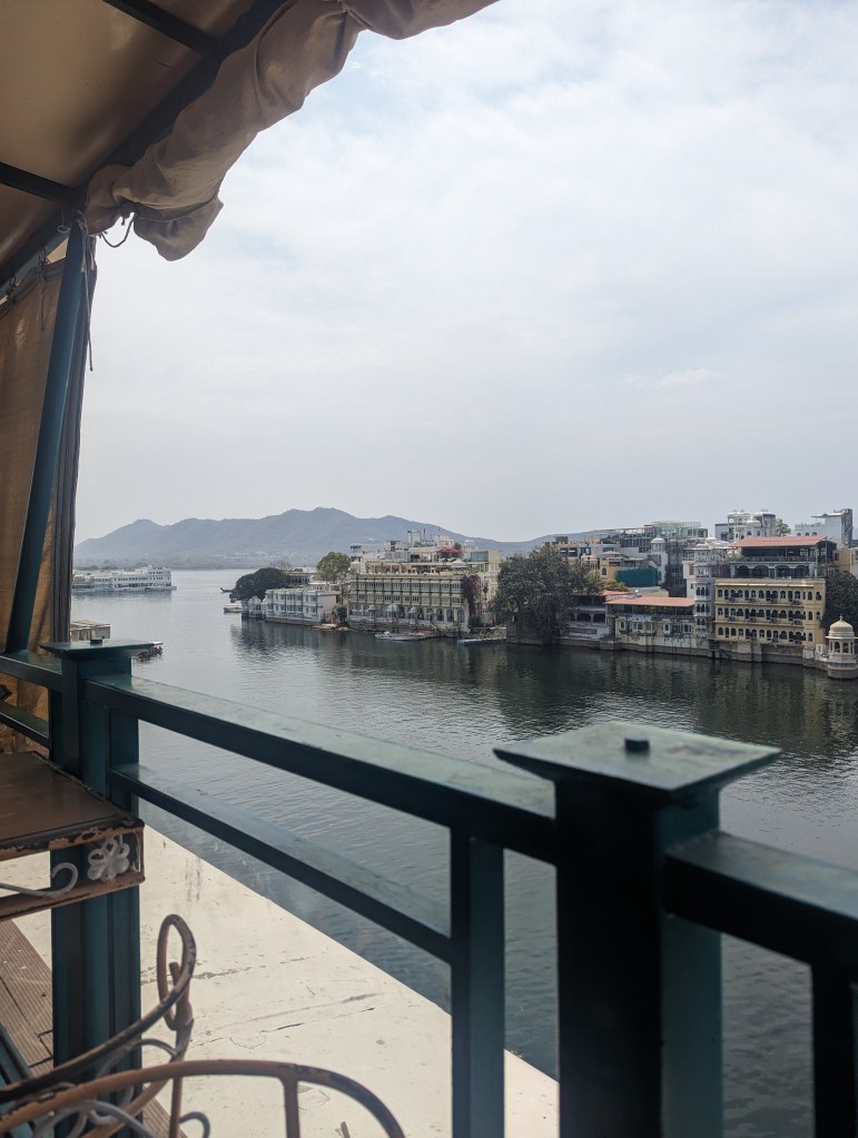 The old city of Udaipur is along the east bank of lake Pichola. The lake has several small islands hosting old forts and palaces which have now been converted into expensive hotels, and the city has many ghats (a set of steps leading down to the water) from which the lake can be reached. The surrounding area is hilly, with many of the hills having perched on them monsoon forts and other estates in varying degrees of disrepair. The cafe, Jheel’s, was over 5 levels of a narrow building right on the water’s edge by Lal Ghat and we arrived early enough to get a spot on the top floor with a lake view.