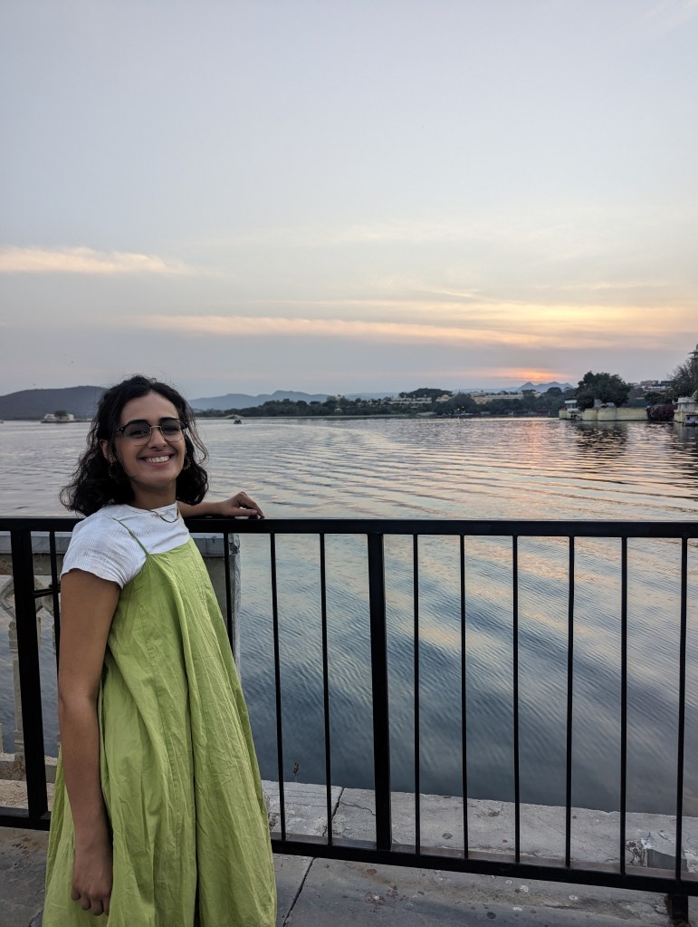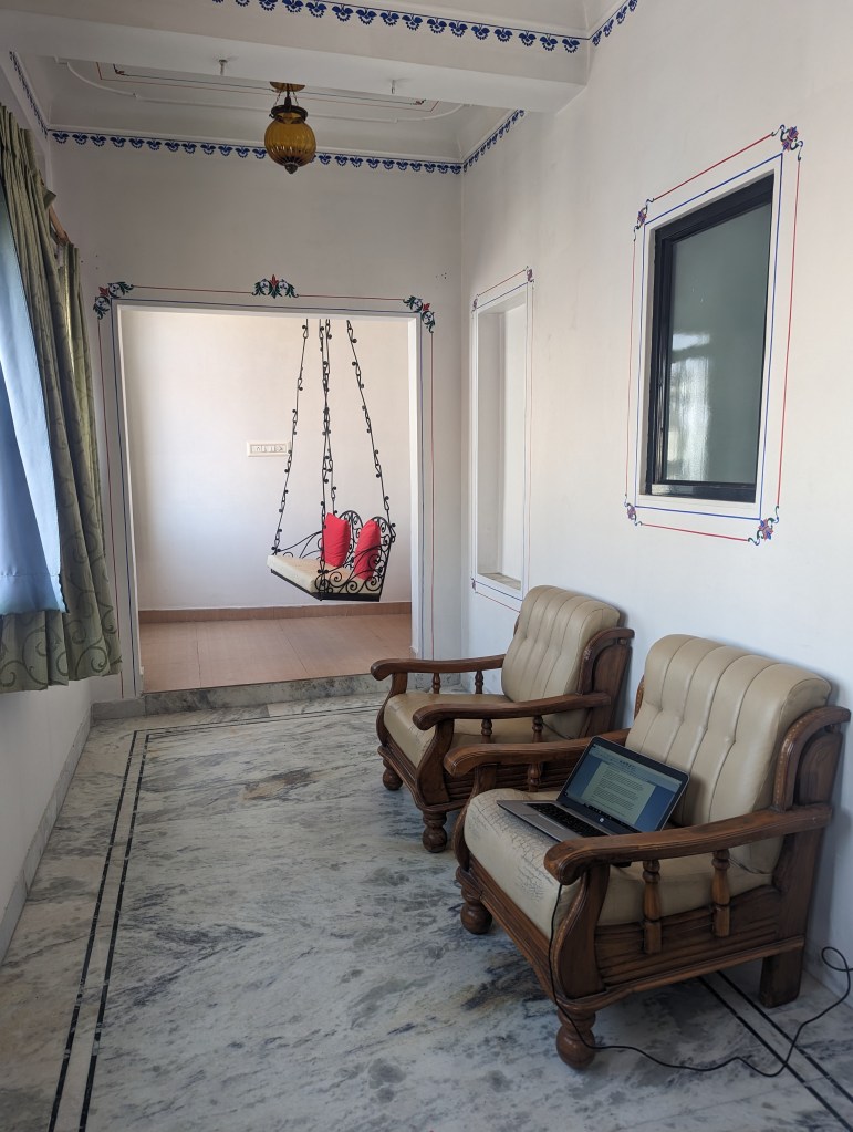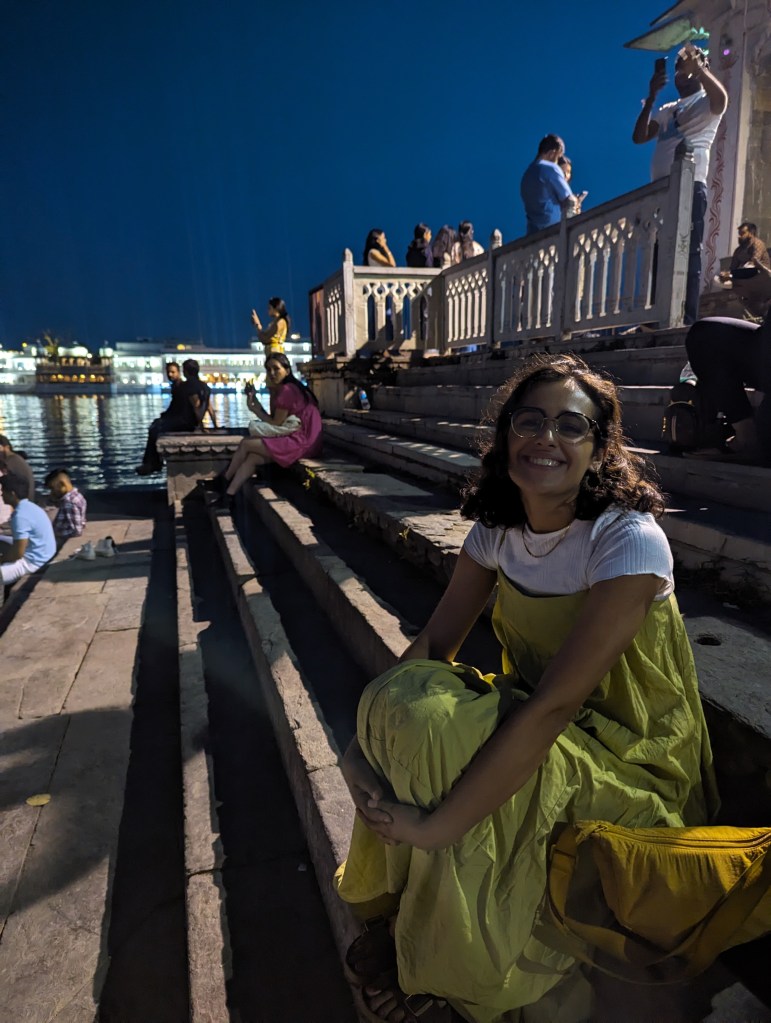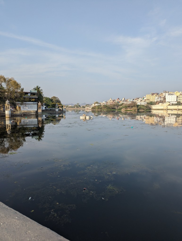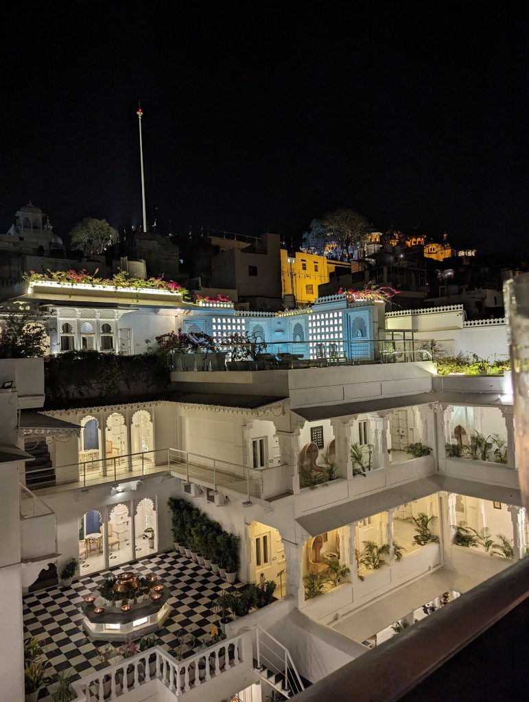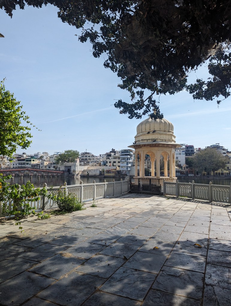 The old city of Udaipur is along the east bank of lake Pichola. The lake has several small islands hosting old forts and palaces which have now been converted into expensive hotels, and the city has many ghats (a set of steps leading down to the water) from which the lake can be reached. The surrounding area is hilly, with many of the hills having perched on them monsoon forts and other estates in varying degrees of disrepair. The cafe, Jheel’s, was over 5 levels of a narrow building right on the water’s edge by Lal Ghat and we arrived early enough to get a spot on the top floor with a lake view.