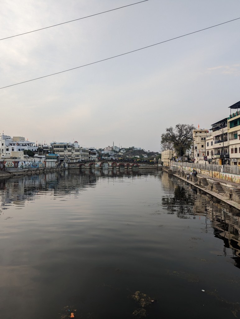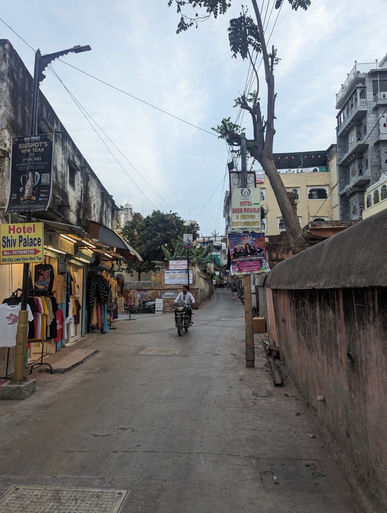 Having eaten, we took a rickshaw up into one of the residential areas where Ellie had booked a pedicure appointment, and I amused myself for the hour or so. The day was getting on by the time we had made our way back down to the city centre. We thought that we might catch one of the sunset boat trips around the lake, though where and when to get them wasn’t entirely clear. From our view in Jheel’s earlier in the day, the quality of the boat trips was evidently variable – some couples were in their own boats being gently motored around, whilst other boats were jammed full of tourists in lifejackets like eggs in a carton. This was purely intellectual, however, as there were no left at Lal Ghat having all left a few minutes earlier.