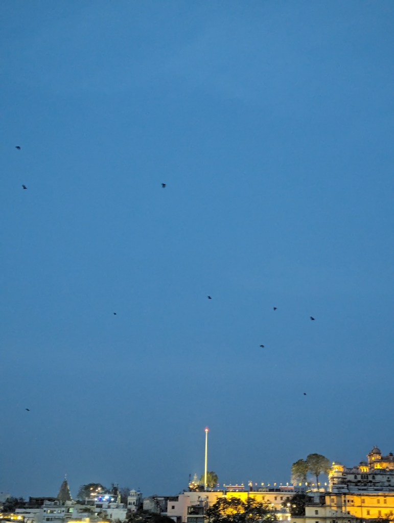 Instead, we walked across one of the rivers connecting Pichola to another, smaller, lake and to Ambrai Ghat looking over the lake on 3 sides. The views as the sun set of the islands, hills and water were magical and we stayed sitting on the steps until dark. As dark fell, the sky became thick with flying foxes flying over the water from the nearby hills, which was quite a sight in its own right. We walked back across the river and to one of the upmarket hotel nearby which had a recommended restaurant with a lake view. We had an excellent cocktail each on the roof, a whiskey sour and a hot toddy, ate a bit of an overpriced dinner (which was still only equivilent to £35 between us for cocktails, starter and main), and headed back to the hotel for the night.