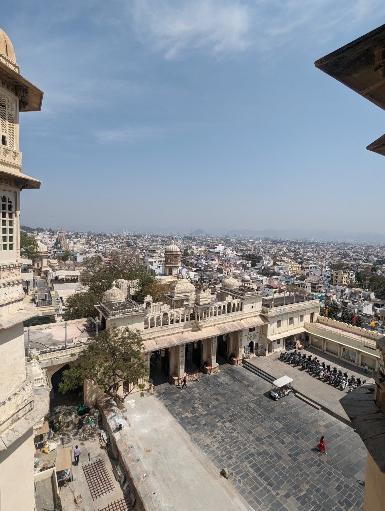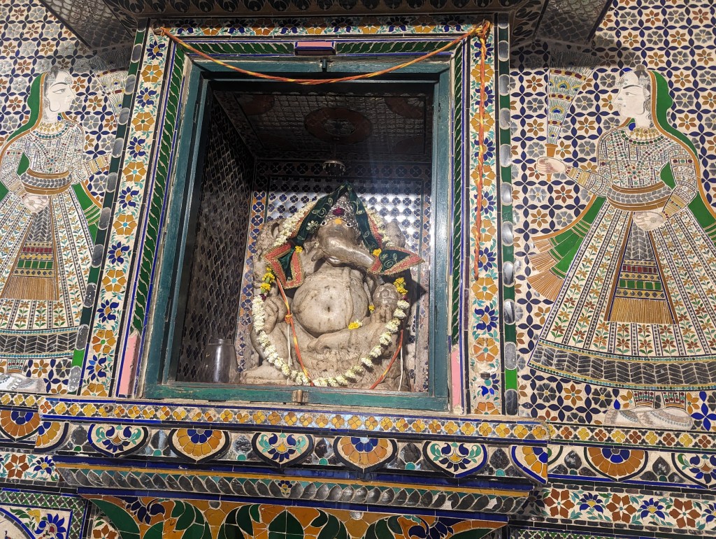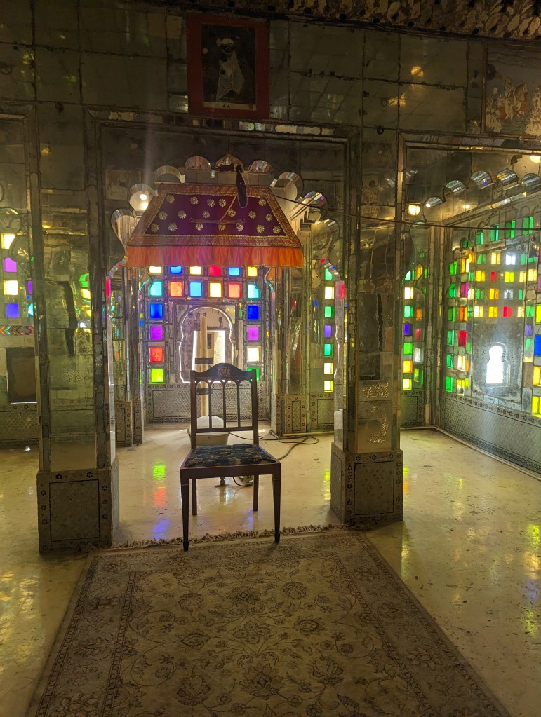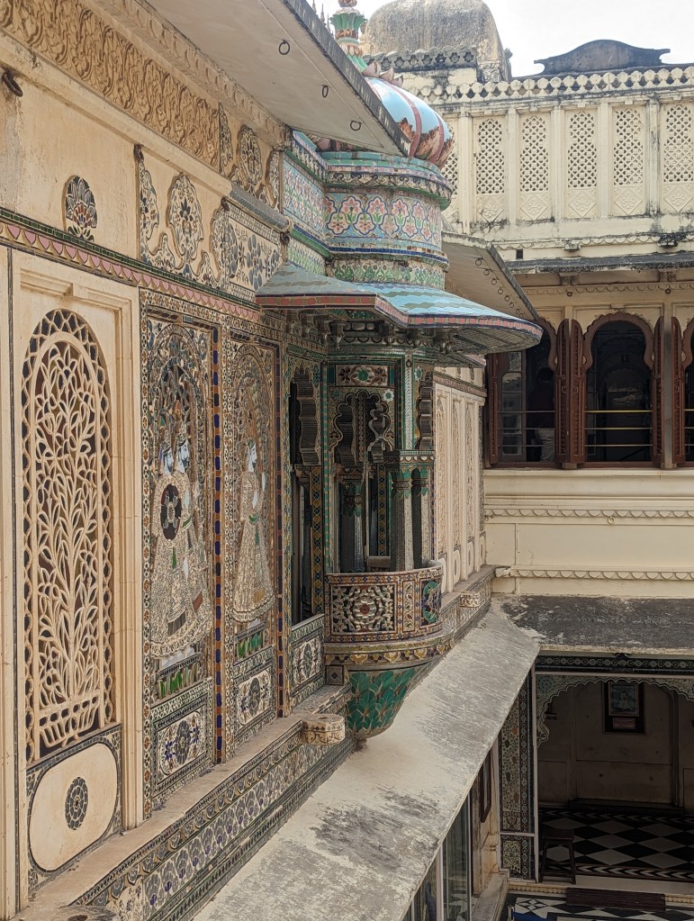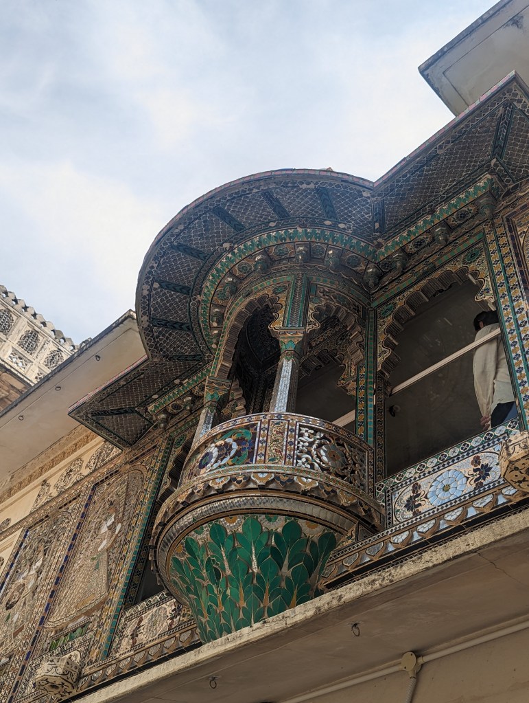 We decided to forego the hotel breakfast on Wednesday and went to another cafe, Cafe Edelweiss, closeby instead which did us great coffee and a bacon & egg sandwich (for me) of all things. Feeling that we had made a very good start to the day, we walked then to the big attraction of Udaipur – The City Palace. The City Palace was the home of the longest continuous dynasty of rulers either in India’s or the world’s history, I can’t remember which. The palace’s massive sandstone facade was situated on a hill by the lakeside looking over the rest of the city. We paid entry and for audio-guides, and made our way around the disorientating network of tiny passageways opening suddenly into rooms made of glass, leafy rooftop courtyards, and bedrooms covered all over in intricate murals. Other than me being accosted by young Indian men for more or less forced selfies, it was well worth the nominal entrance fee.