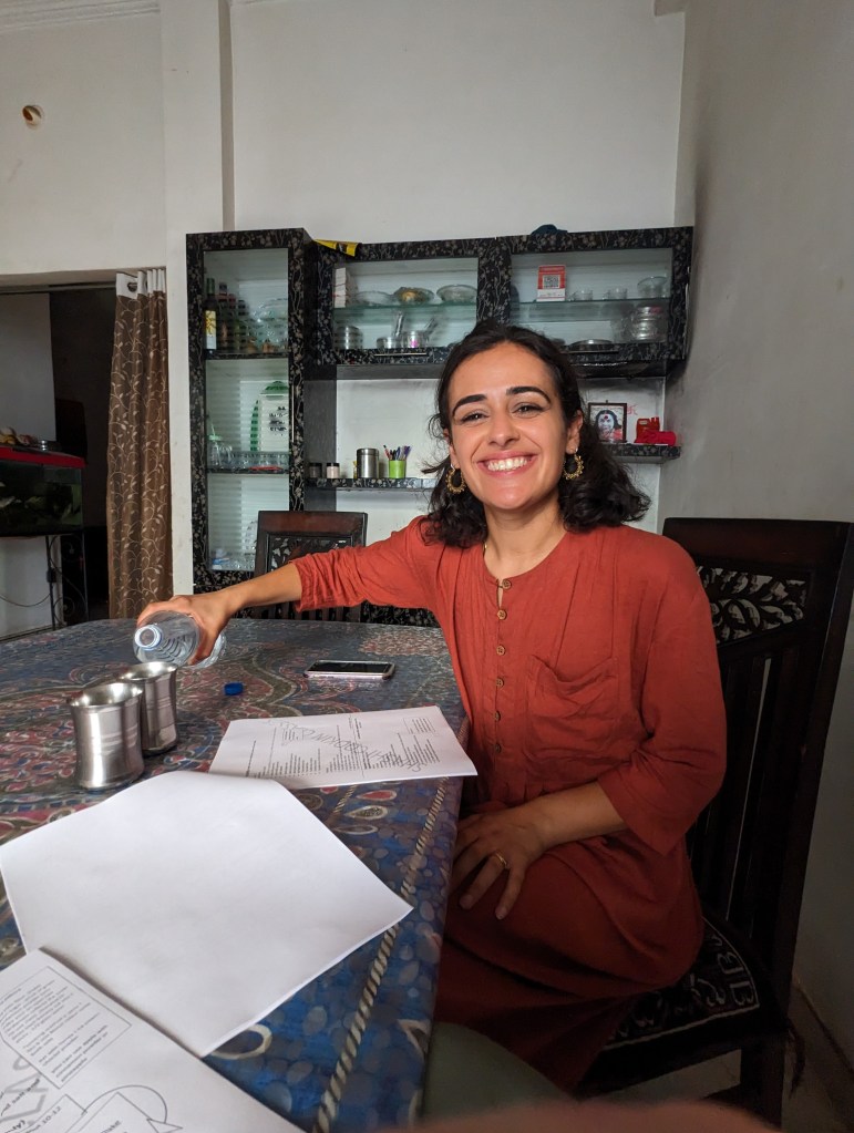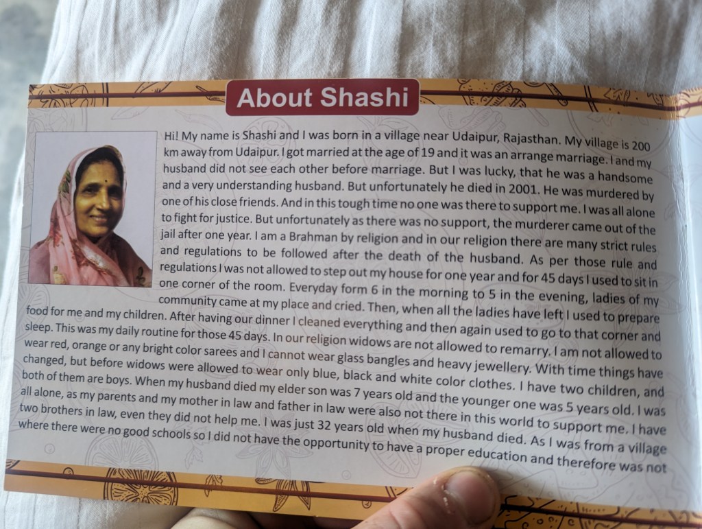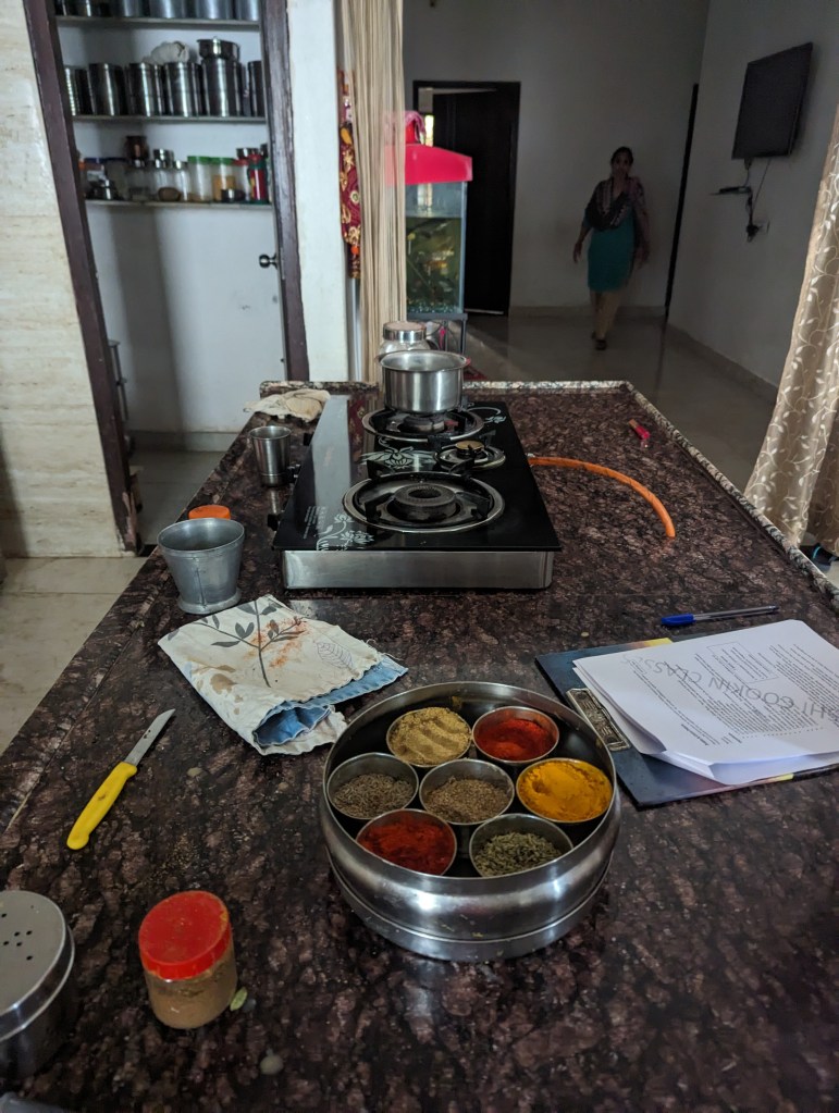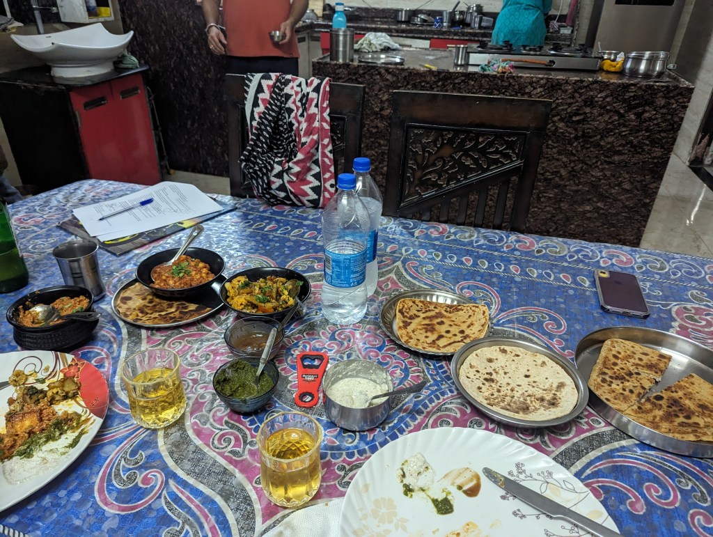 After some excercise and a rest, we walked the 20 minutes or so to the address of the cooking class in a residential area nearby. It was run by a elderly Rajasthani lady named Shashi, into whose house we were shepherded by one of her sons and offered a seat at the table. It became apparent after a little while that we were the only people in the evening class, and after about 20 minutes or so (she later told us that she had fallen asleep in the afternoon and had to be roused by her son) Shashi herself emerged.