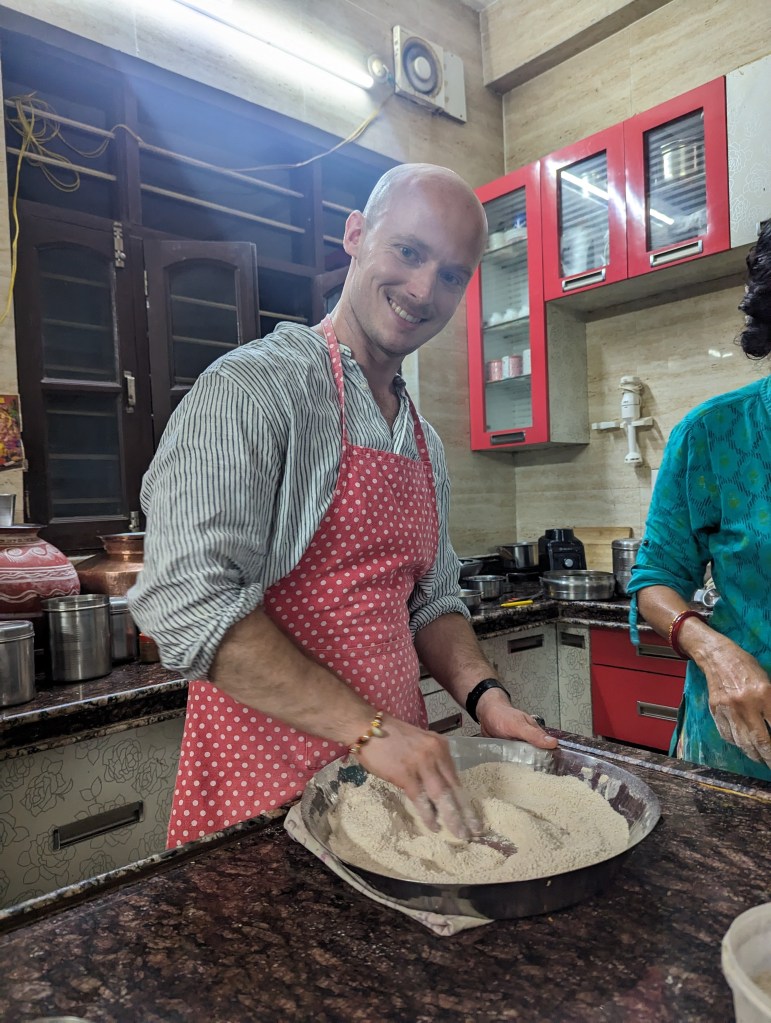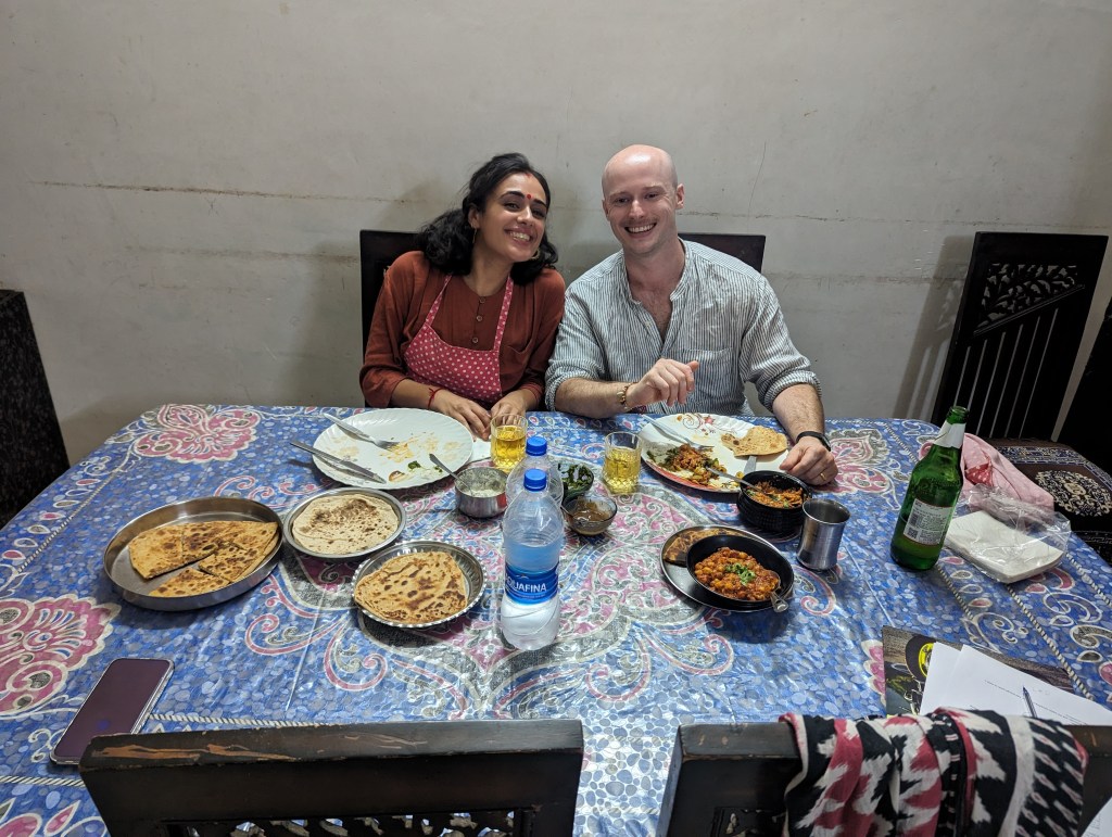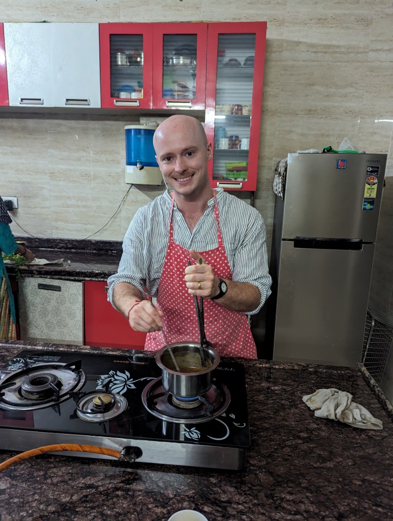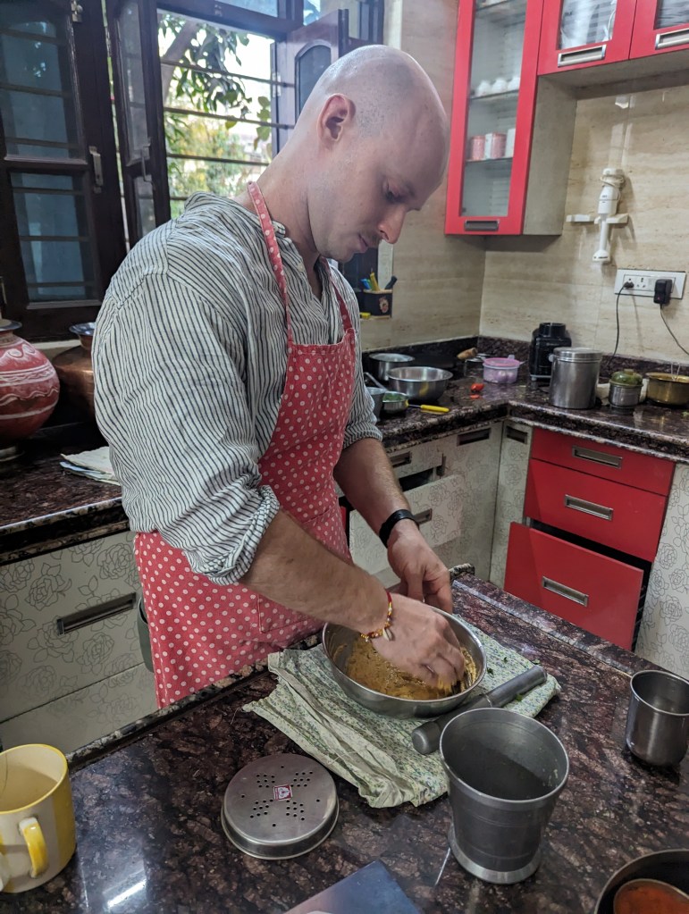 The kitchen we used was clearly the family’s kitchen, and Shashi’s two adult sons were around to help out at various times. One was tasked with explaining the principle of the magic sauce as his English was very good, one was responsible for plating up and serving all the food we had made, and seemed to know when to appear and get ingredients out of the fridge without Shashi saying anything to him. At times, a granddaughter would appear with a drawing she’d made, or the family’s labrador would wander through the kitchen and out the front door. All this added to the fun and we left for the hotel feeling very full and very happy.