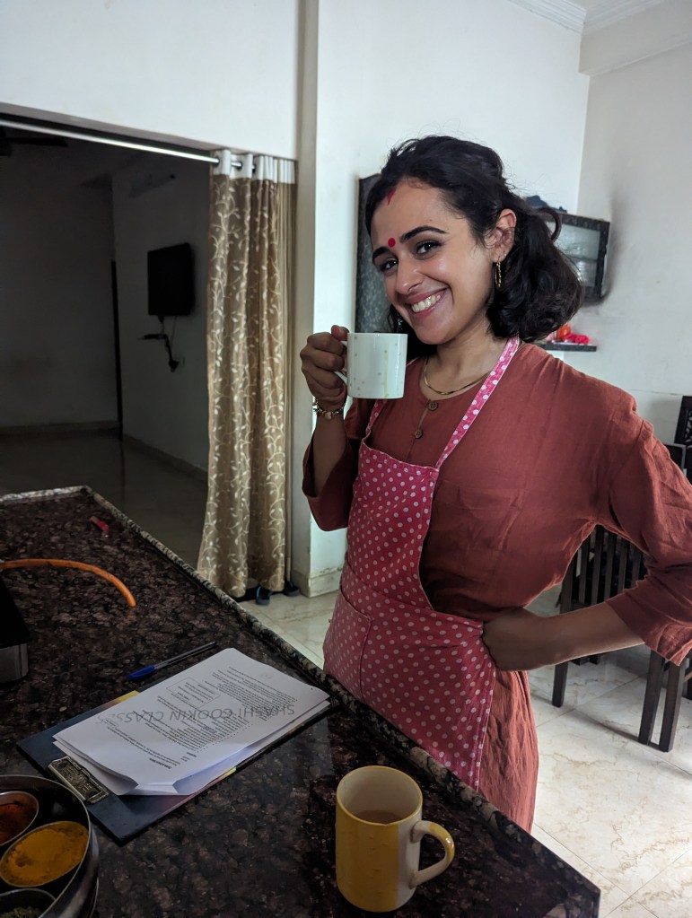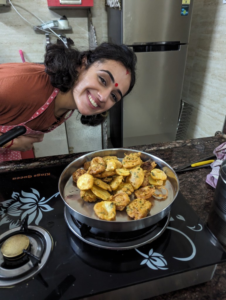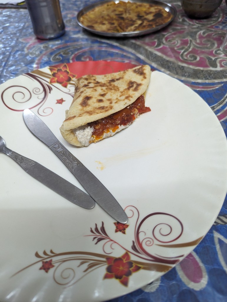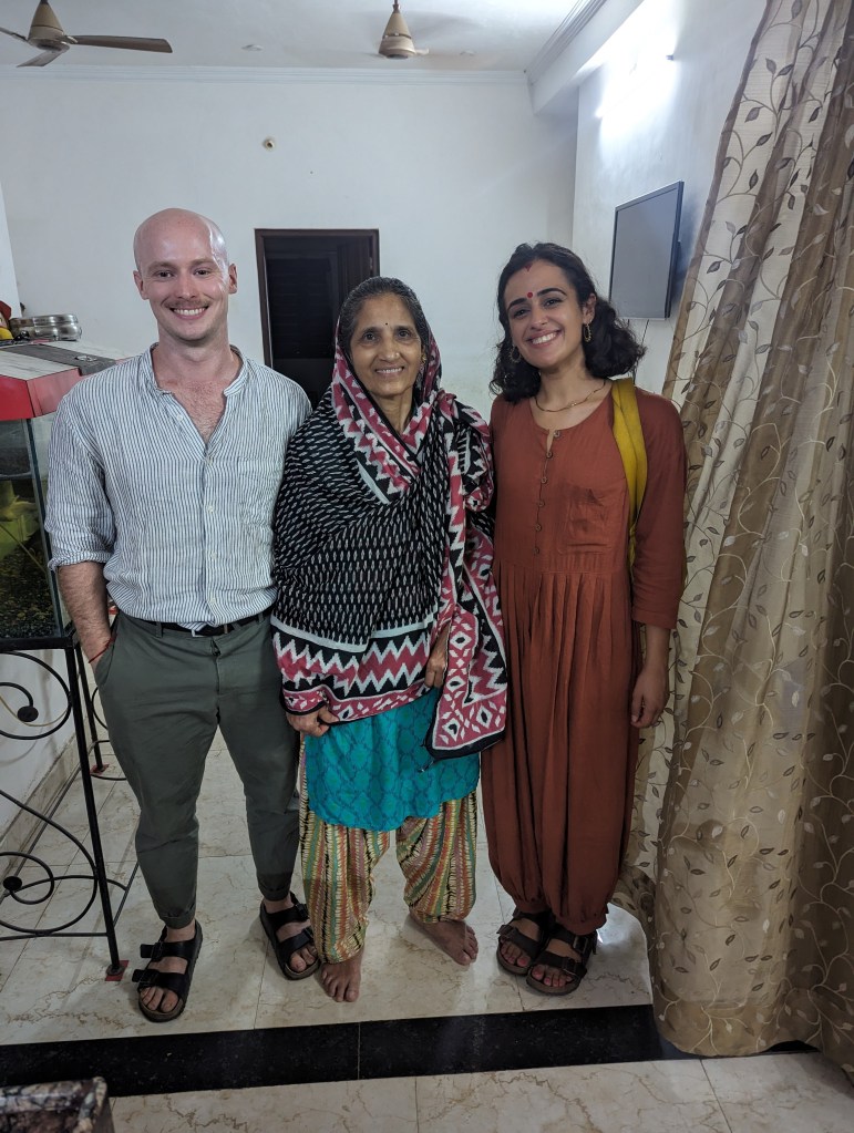 The kitchen we used was clearly the family’s kitchen, and Shashi’s two adult sons were around to help out at various times. One was tasked with explaining the principle of the magic sauce as his English was very good, one was responsible for plating up and serving all the food we had made, and seemed to know when to appear and get ingredients out of the fridge without Shashi saying anything to him. At times, a granddaughter would appear with a drawing she’d made, or the family’s labrador would wander through the kitchen and out the front door. All this added to the fun and we left for the hotel feeling very full and very happy.