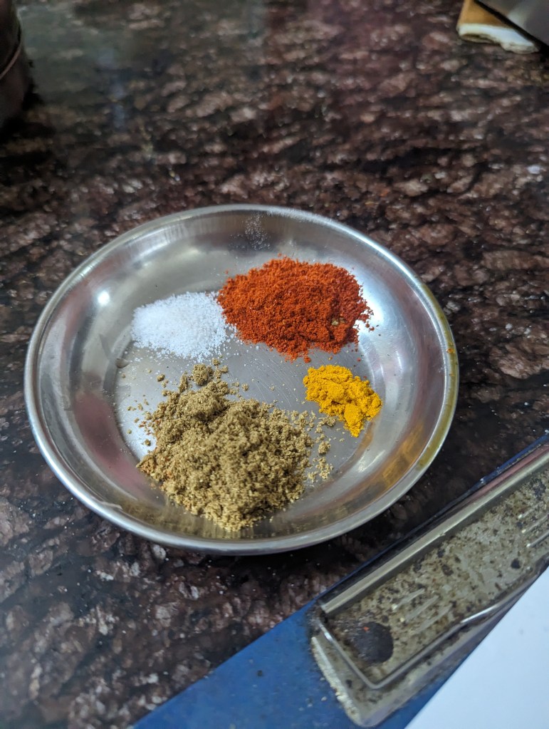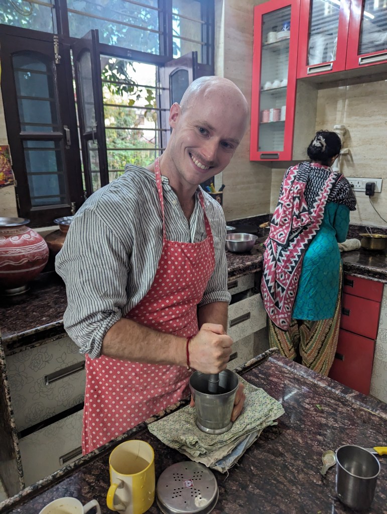 In the intervening time, we had been given a little booklet that had Shashi’s recipes and her life story inside. The story was quite remarkable, and I have attached photos of the booklet above for anyone interested in reading it to save me paraphrasing. We had the best part of 4 hours with Shashi, which we both agreed on reflection were some of the best of the trip so far. We started by making masala chai from stratch (not including the tea powder), by boiling milk and tea powder with freshly ground cardamom, cloves, nutmeg, and at least two heaped tablespoons of sugar (which has been recently reduced from four). We moved onto onion and potato pakoras with both a coriander & chilli and mango chutney. These we ate as a starter whilst Shashi and her sons prepared ingredients for the curries.
