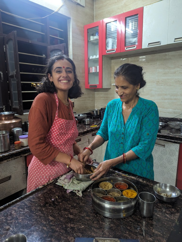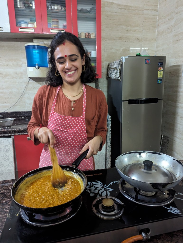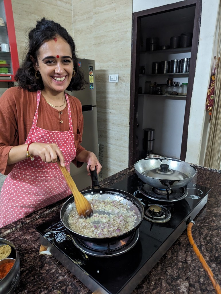 Shashi’s cooking revolved around the “magic sauce” which is apparently ubiquitous in North Indian cooking. The sauce is a base of spices, onion, ginger, garlic and tomato which can then be kept in the fridge for several days, and be used for almost all North Indian curries by adding different additional ingredients. In this way, we prepared the magic sauce and used it to make a sweet chickpea curry and a creamy paneer butter masala (the paneer being freshly made by Shashi that afternoon). At the same time, she had us preparing a dry potato and cauliflower curry and a yoghurt dip.