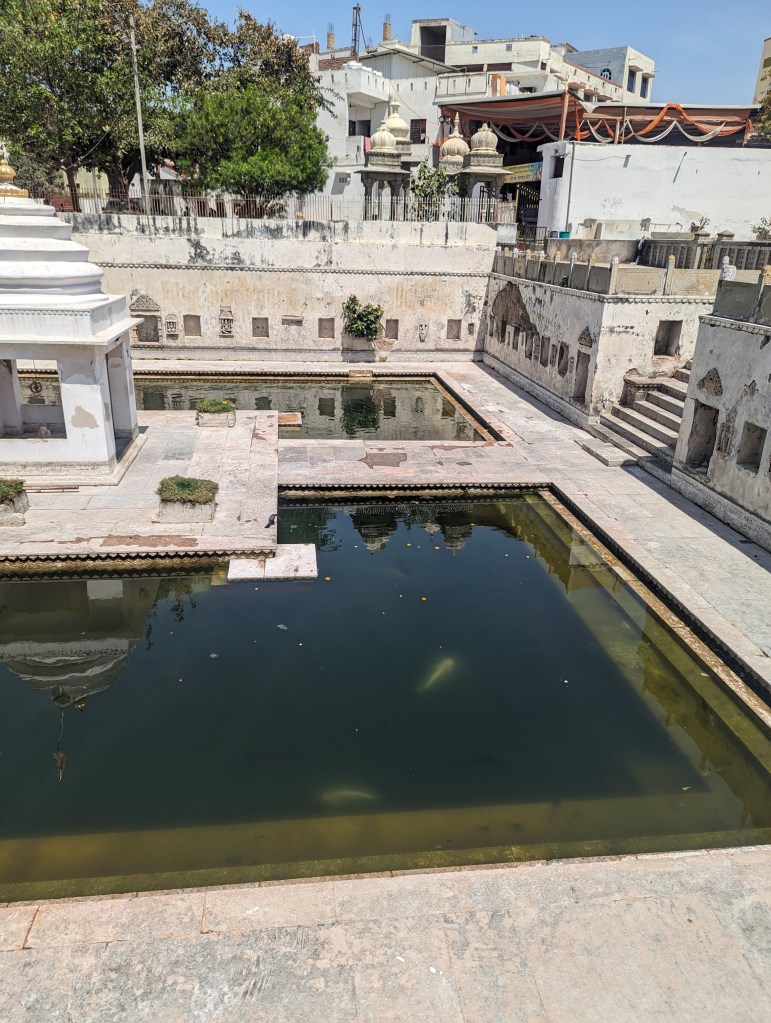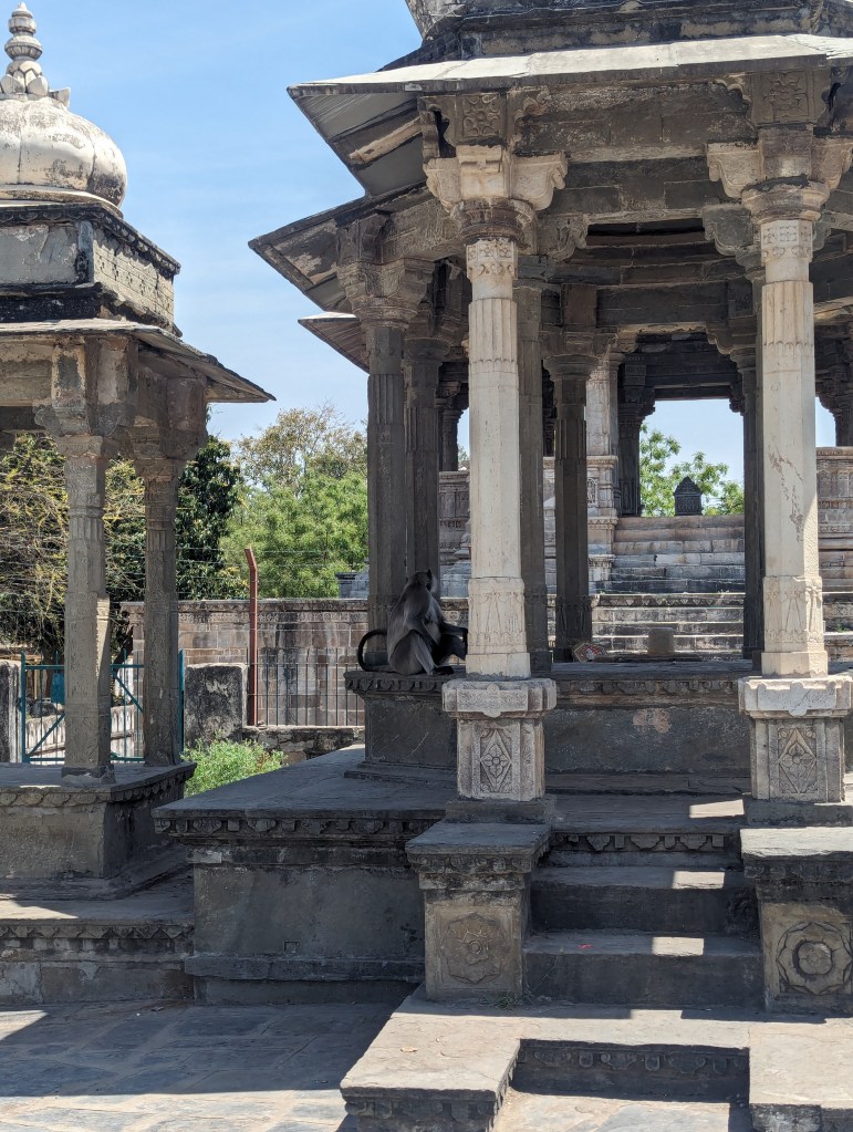 We headed first for the cenotaphs of Ahar, which were the ornate tombs of the ruling dynasty on the edge of the city. The cenotaphs were in a walled compound that was chained up on all sides. We asked a few people but it seemed that it was either closed indefinitely or closed today. Either way, we weren’t allowed in. There was, however, a park just to one side of the cenotaph compound. It was strange place, where there were a few of the old tombs on the outside of the compound and with two sunken semi-direlict water temples with ancient-looking carvings on the walls. There was a group of lads sat on one of the tombs who seemed to be there solely to politely ask us to take our shoes off before we walked down into the water temple. As we climbed the stairs again, a troop of huge monkeys climbed over the compound walls and sat on one of the tombs. I snapped a couple of pictures before hurrying away, not fancying my chances if they weren’t in a friendly mood.