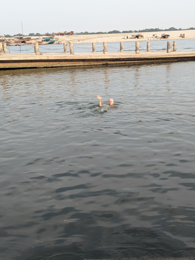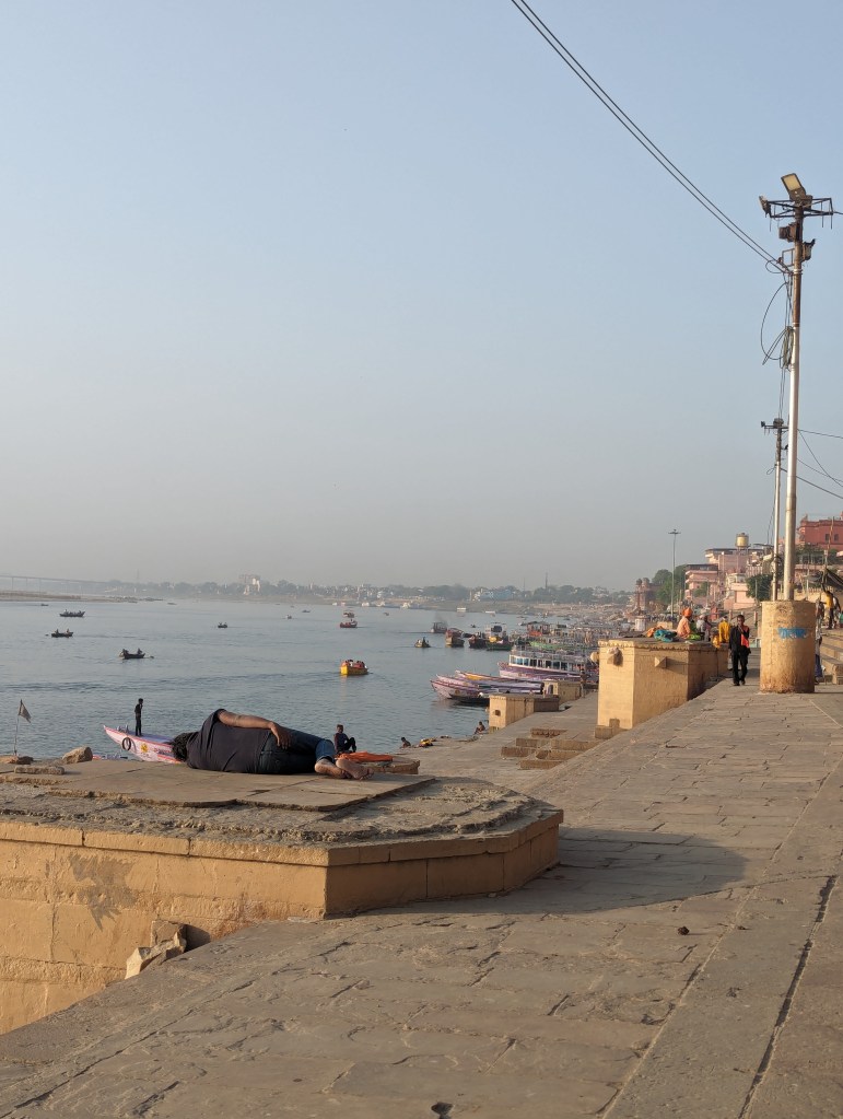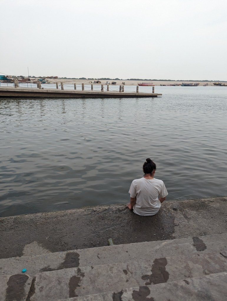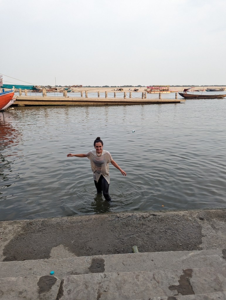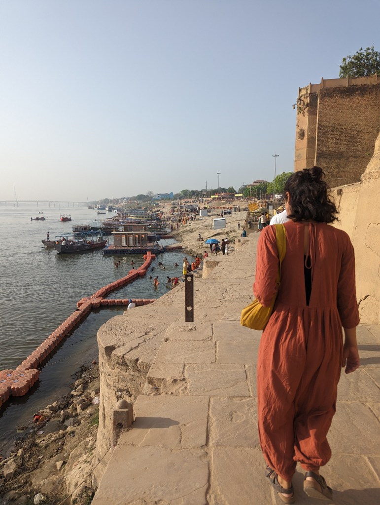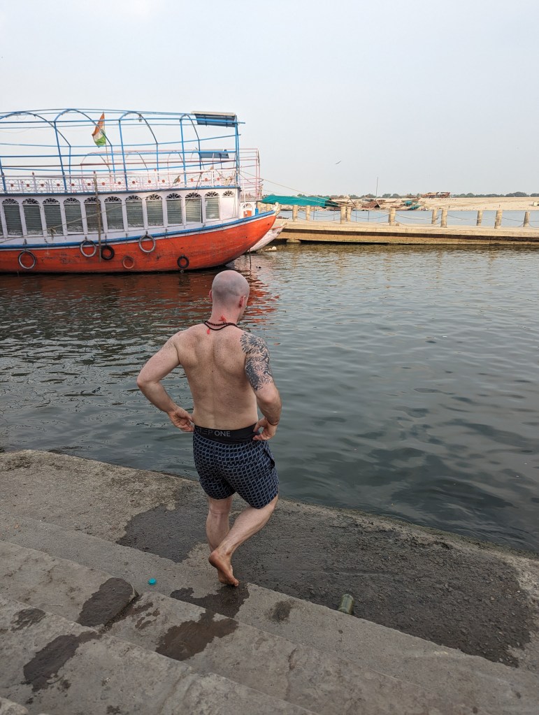 Rob met me post class and we went back down to the river banks. Bathing in the Ganges, as we have spoken about before, has huge spiritual importance for Hindus and Rob had been keen to do it here – if not quite the twice a day we had been instructed to by the sweet young men on the Shekhawati-Jaipur train. I had been more hesitant given the levels of dirt/health concerns cited online (don’t google it mum) plus the idea that certain bodies are deemed to pure to burn and are ?put in the Ganges as is and might float past. However, having been in the city several days, seen the relative cleanliness of the water and the reams and reams of Indians taking their ritual dips in I was on board too. We picked a relatively quiet and chilled stretch with some young men messing around in the water (people play catch in it like a European beach completely intertwined with others in silent prayer) and some women bathing too. Rob took a full-on swim whilst I slightly more cautiously dunked down fully-dressed as is the done thing for women. We both agreed it was pretty magical to dip in such a revered body of water, and it did the job of cooling us down a bit too.