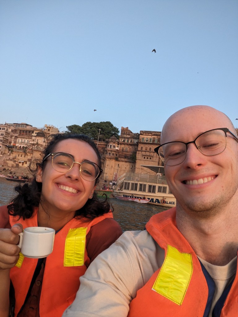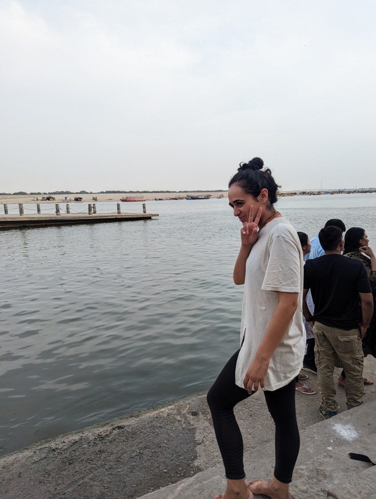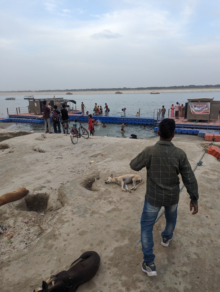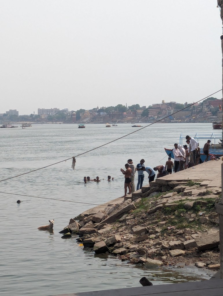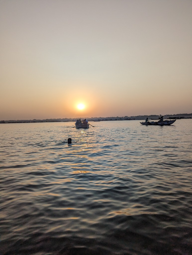 Rob met me post class and we went back down to the river banks. Bathing in the Ganges, as we have spoken about before, has huge spiritual importance for Hindus and Rob had been keen to do it here – if not quite the twice a day we had been instructed to by the sweet young men on the Shekhawati-Jaipur train. I had been more hesitant given the levels of dirt/health concerns cited online (don’t google it mum) plus the idea that certain bodies are deemed to pure to burn and are ?put in the Ganges as is and might float past. However, having been in the city several days, seen the relative cleanliness of the water and the reams and reams of Indians taking their ritual dips in I was on board too. We picked a relatively quiet and chilled stretch with some young men messing around in the water (people play catch in it like a European beach completely intertwined with others in silent prayer) and some women bathing too. Rob took a full-on swim whilst I slightly more cautiously dunked down fully-dressed as is the done thing for women. We both agreed it was pretty magical to dip in such a revered body of water, and it did the job of cooling us down a bit too.