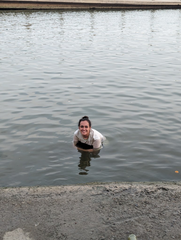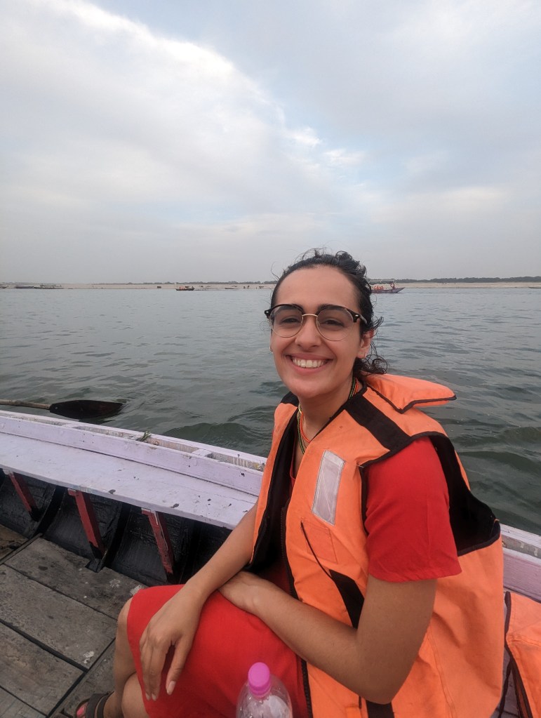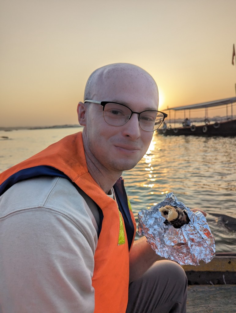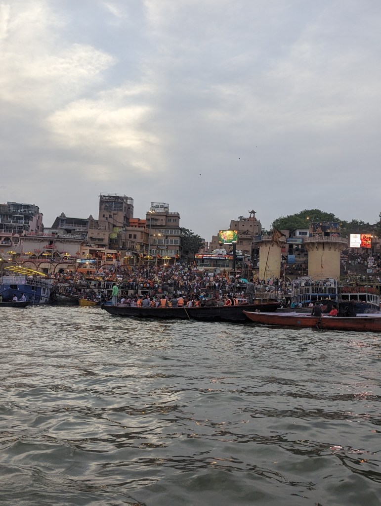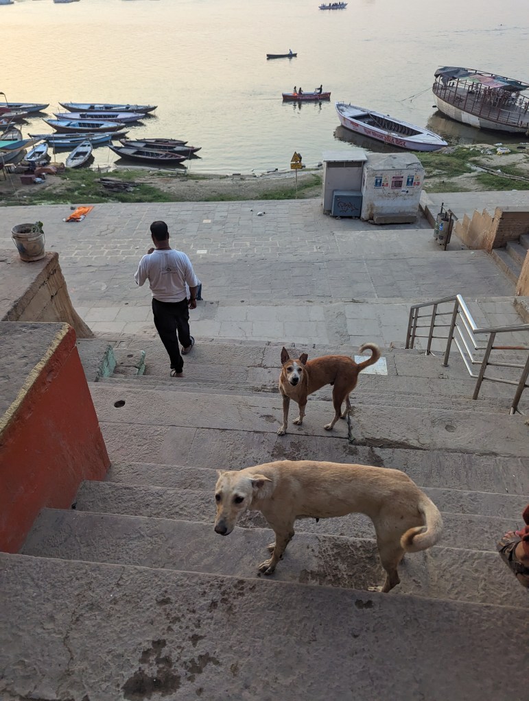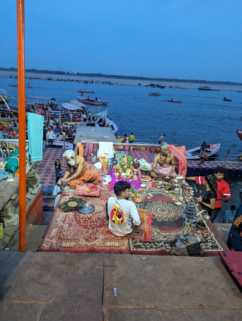 Rob met me post class and we went back down to the river banks. Bathing in the Ganges, as we have spoken about before, has huge spiritual importance for Hindus and Rob had been keen to do it here – if not quite the twice a day we had been instructed to by the sweet young men on the Shekhawati-Jaipur train. I had been more hesitant given the levels of dirt/health concerns cited online (don’t google it mum) plus the idea that certain bodies are deemed to pure to burn and are ?put in the Ganges as is and might float past. However, having been in the city several days, seen the relative cleanliness of the water and the reams and reams of Indians taking their ritual dips in I was on board too. We picked a relatively quiet and chilled stretch with some young men messing around in the water (people play catch in it like a European beach completely intertwined with others in silent prayer) and some women bathing too. Rob took a full-on swim whilst I slightly more cautiously dunked down fully-dressed as is the done thing for women. We both agreed it was pretty magical to dip in such a revered body of water, and it did the job of cooling us down a bit too.