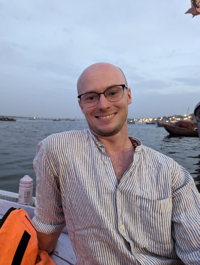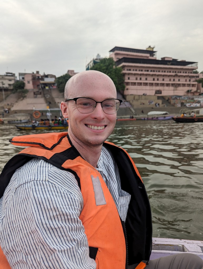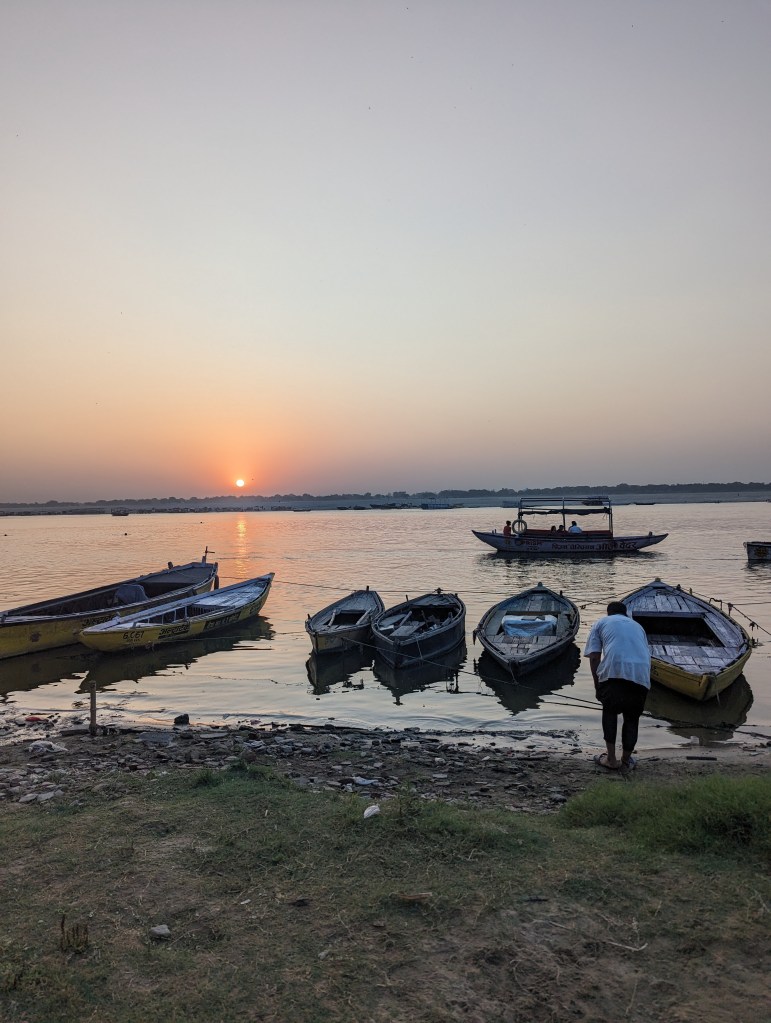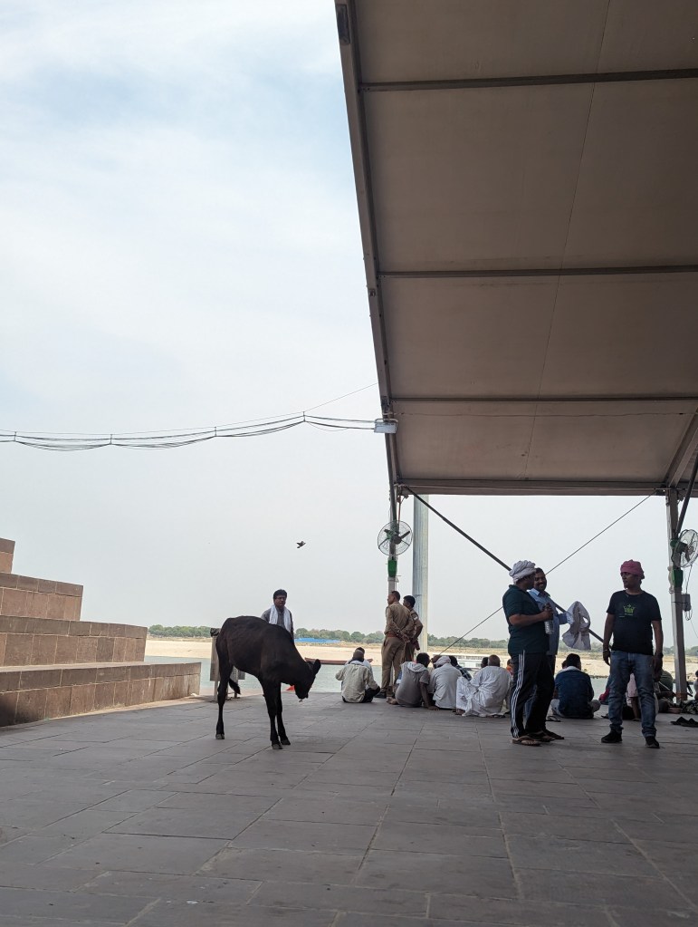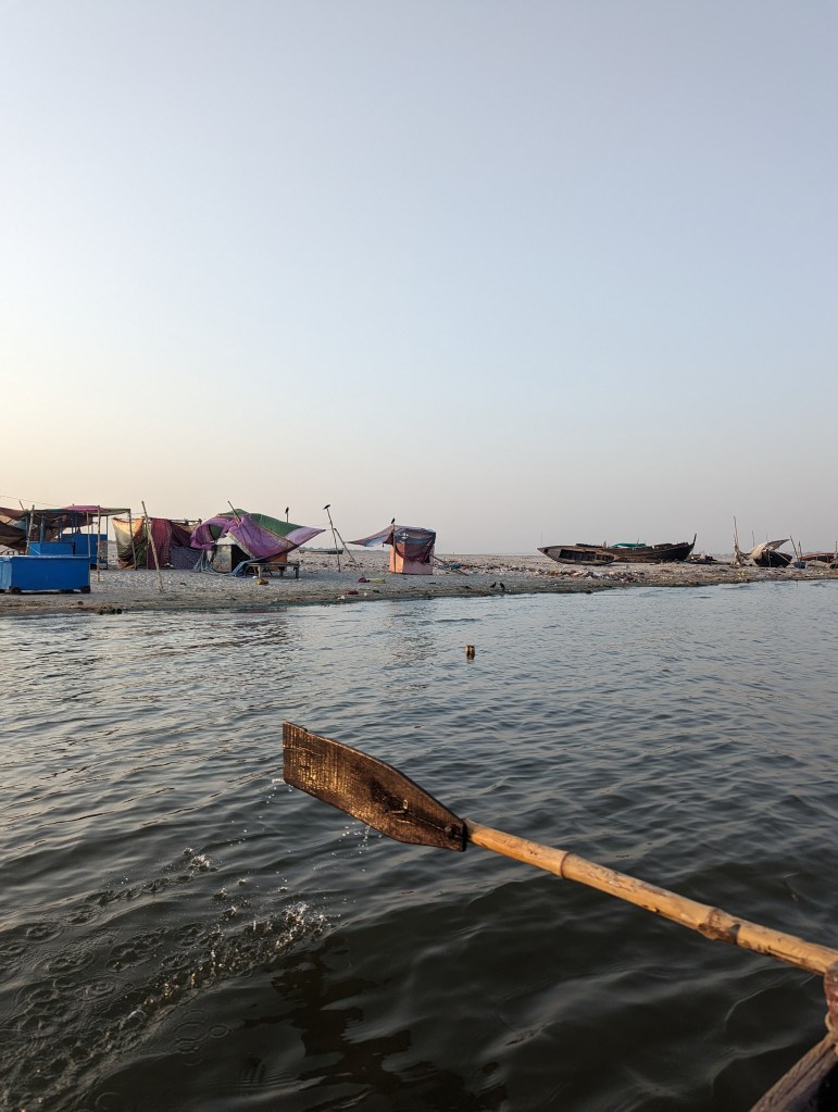 We arrived at the ghat and met Chandu, who supplied us with coffee and pastries to take with us on the boat. We boarded the row boat and spent the next hour or so slowly drifting down with the flow of the water past the ghats in the early morning light. Chandu, a very sweet man who had lived and worked in cafes in Varanasi for decades and who sported quite incredible tufts of hair from his earlobes, interspersed the rowing with facts about the passing buildings and history of the city. Life was already in full flow by 6am as we passed by, with people bathing, worshiping and milling around on the steps down to the Ganges. Chandu rowed the boat over to the other side of the river which, given it was summer season, was a sand-bank stretching back at least a kilometer in front of the land’s edge. Here, there was a gentler slope down to the water, and so many people took an early morning boat across to bathe without the risk of losing their footing on the slippery steps of the ghats.