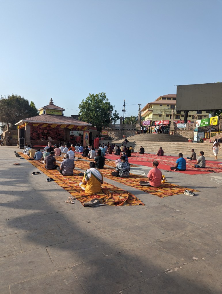 After an hour or so, Chandu moored the boat, and we set out on foot south along the ghats. We passed countless temples, shrines, priests for hire, rituals, ceremonies, and funeral pyres before ending in Assi ghat, the southernmost ghat. Here, we watched the end of an open air yoga class being taught from the stage to locals who come at 5am every morning to practice. The class was just finishing as we arrived, and we watched for a few minutes before rickshawing back to Bread Bread Bakery with Chandu.