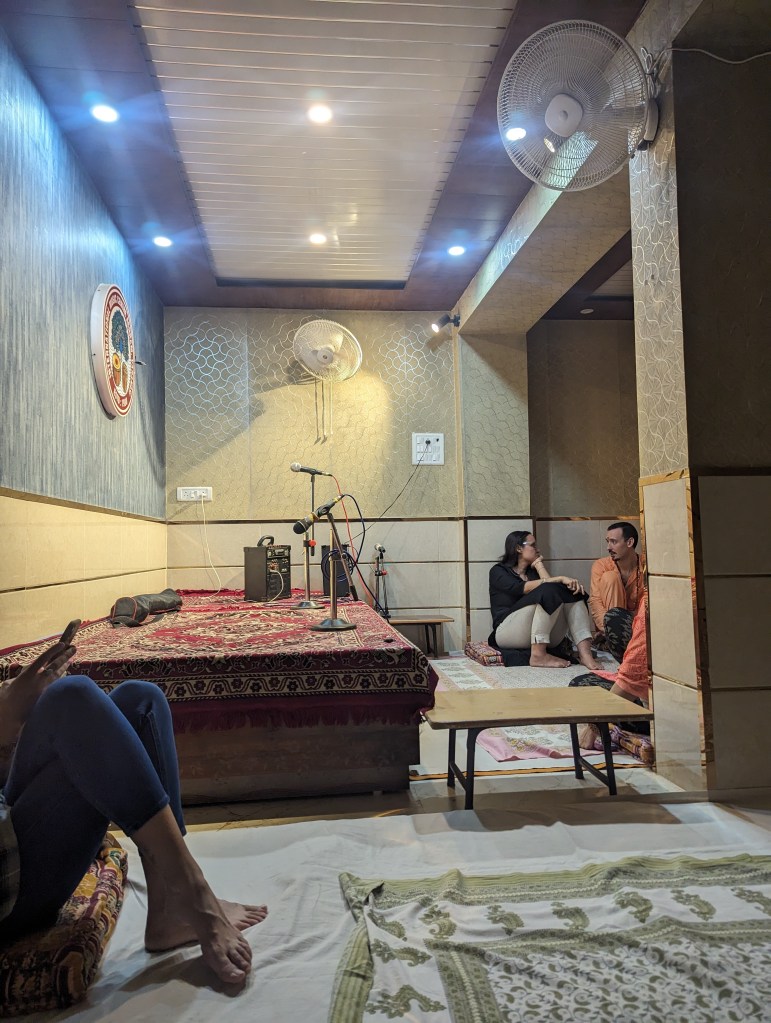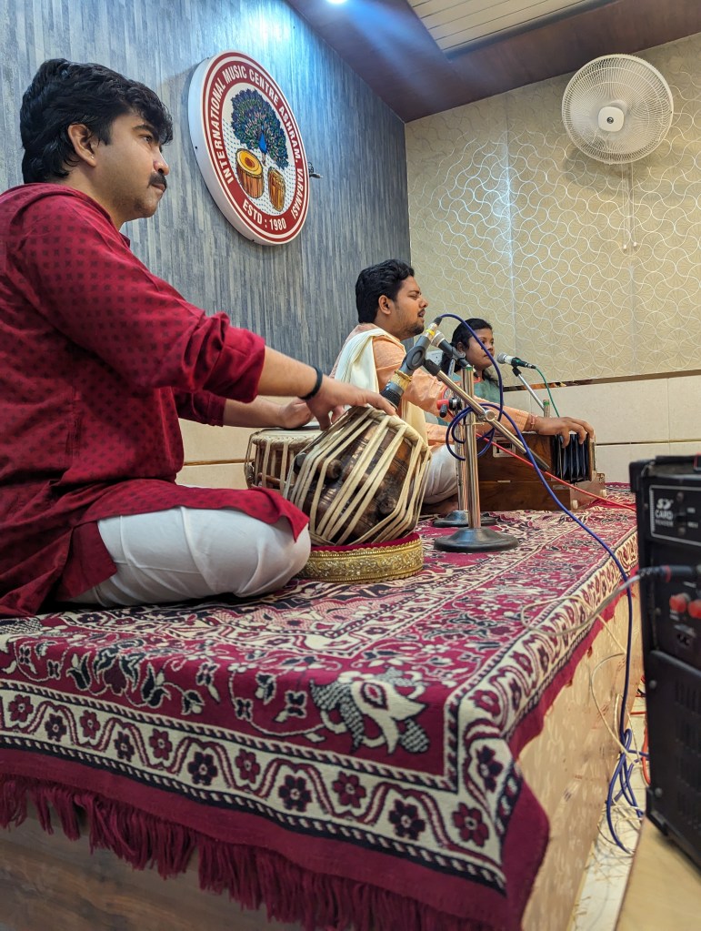Once back at the homestay, we sat out the heat of the day under the air-conditioning, and got ourselves ready to go back out in the evening. There was a music and dance performance taking place at the International Music Centre Ashram, and so we headed in a rickshaw back into the ghats backstreet area to find it. The Music Centre Ashram was a small room with a stage, a few rows of chairs, and a floor seating area up front and to the side. Most of the seats were already taken by what seemed to be a large spiritual community of Spanish people, so we found a seat on the ground to the side and waited for the performance to begin.