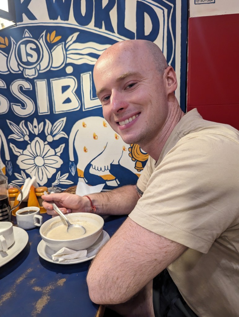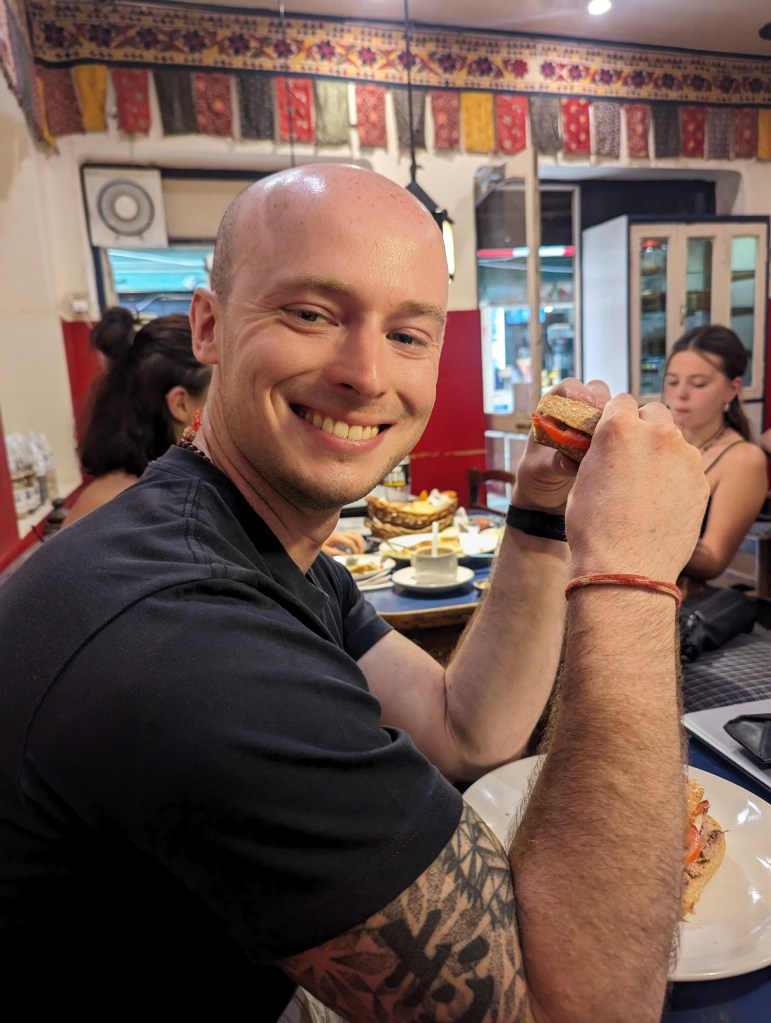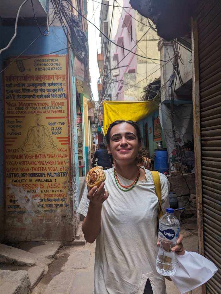 You may be surprised to read that we had booked another class with our pistashio hand-feeding yoga instructor. Despite his eccentricities, it had been nice to attend an Indian yoga class that challenged both of us whilst still making us laugh, so we rushed out again on Monday morning for a Brown Bread Bakery pastry en route to his ‘studio’. Cinnamon rolls and chocolate croissants in hand, we headed in to another hilarious class, ranging from random singing and assurances that he could see our pure souls, to some thigh-slapping (our thighs, by him) and relationship-instructions which always felt well-meaning but would raise more than a few eyebrows in a UK yoga class. He finished up by explaining how we would most likely see his face when finally achieved Samadhi (a state of meditative consciousness) and we giggled our way back along the Ghat to the aforementioned bakery we essentially lived in in Varanasi.