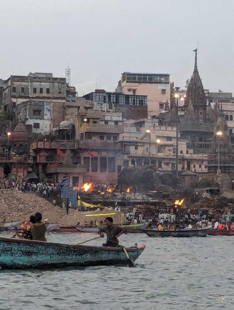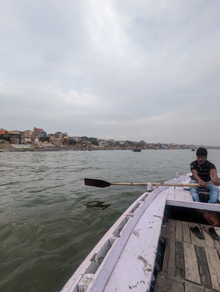 We had left ourselves, for the second time in 24 hours, barely enough time to get back to the homestay before we were supposed to be picked up for a evening boat trip organised by Harish. We raced back in a rickshaw, disembarked at the homestay, and stepped straight into another waiting rickshaw that took us down to the southern ghats. Here, a man with rickets was waiting for us and led us down to the quay and put us on a row-boat. He told us that our boatman spoke no English, which was fine by us.