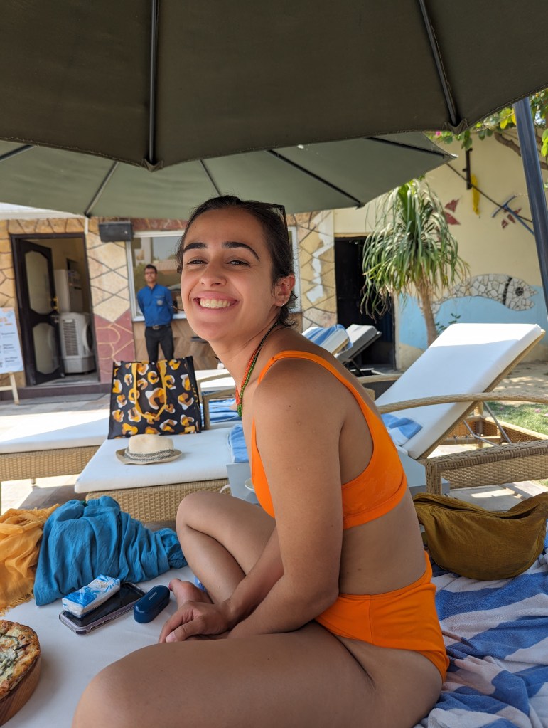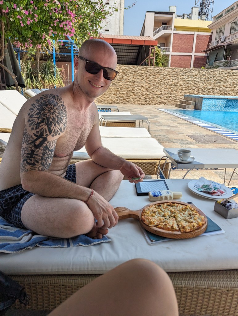 We spent a pleasant couple of hours at the poolside with some cold drinks, and enjoyed the glorious cool of the pool in the scorching heat of the day. The pool was largely deserted again whilst we were there, save from a couple of kids quietly playing down one end, evidently because no-one else was foolish enough to sit around outside even if it was in the shade of a parasol. However, we didn’t quite get heat stroke, and even ordered a couple of pizzas to our sun loungers for lunch. They were passably good, though are the likely culprit for Ellie’s nascent stomach bug that evening.