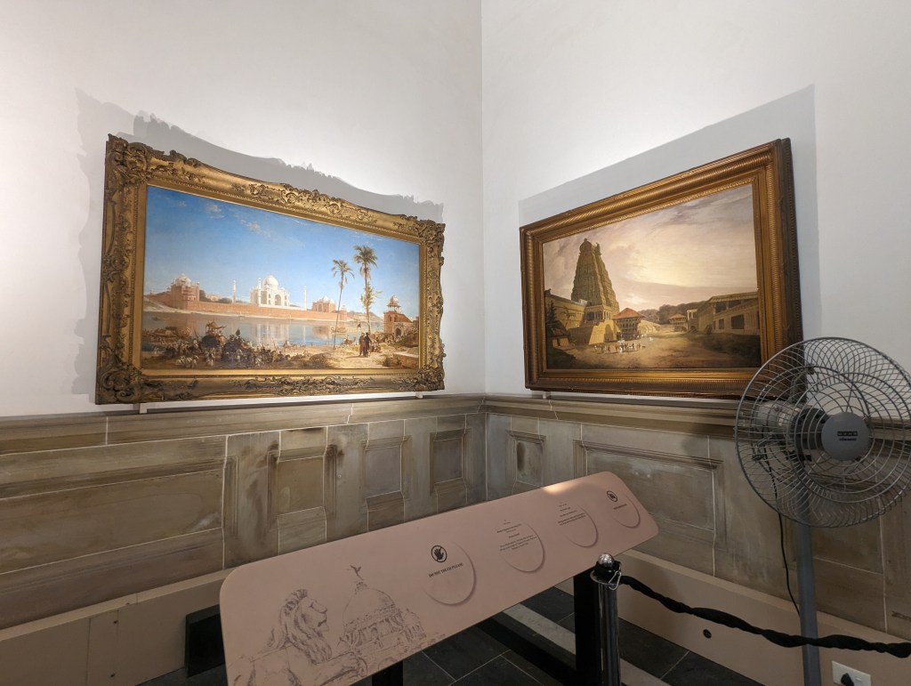 From the art gallery we crossed the road and went back into the Victoria Memorial. Honestly, the building was so impressive it warranted another look in its own right, but additionally we decided that we should have a look inside, given we were so close. Inside, the building was divided into only two large rooms, each with wide galleries on either side. A couple of these were blocked off, but the other two displayed a rather eclectic mix of colonial era art. In one wing, there were huge paintings of scenes such as the Maharaja of Jaipur riding on an elephant with the future Edward VII, along with model galleys and the enevitable display of rifles and cutlasses. The other wing had a gently interesting exhibition showing paintings of Indian monuments, temples and palaces by British artists as they travelled the country for display back in the UK.