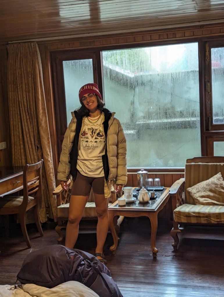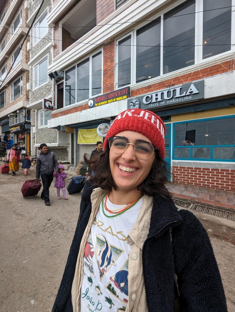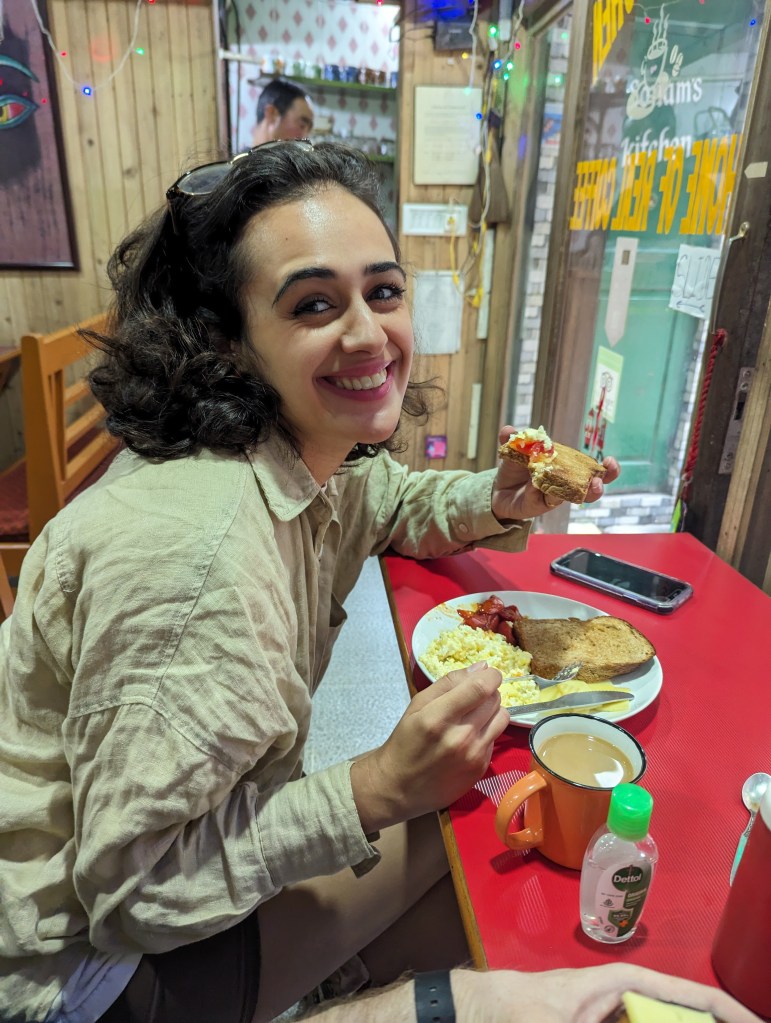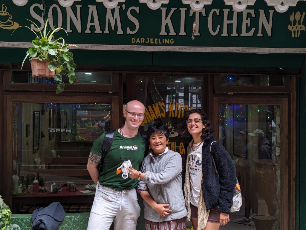 We had a leisurely check-out time of 11am in Darjeeling, so we made the most of the lie-in and slow pack before dropping our bags at reception and heading, once more, to Sonam’s Kitchen. In the course of the trip it has become apparent that there is nothing we love more than a good breakfast & coffee spot, and Sonam’s was exactly that. I was feeling hungry again, and the fresh bread/fried tomato/scrambled eggs/hash brown/pot of strong black coffee combo was an absolute delight. Sonam even insisted on getting a photo with us on the way out, seemingly largely because she was absolutely obsessed with our Animal Aid t-shirts (see photo).