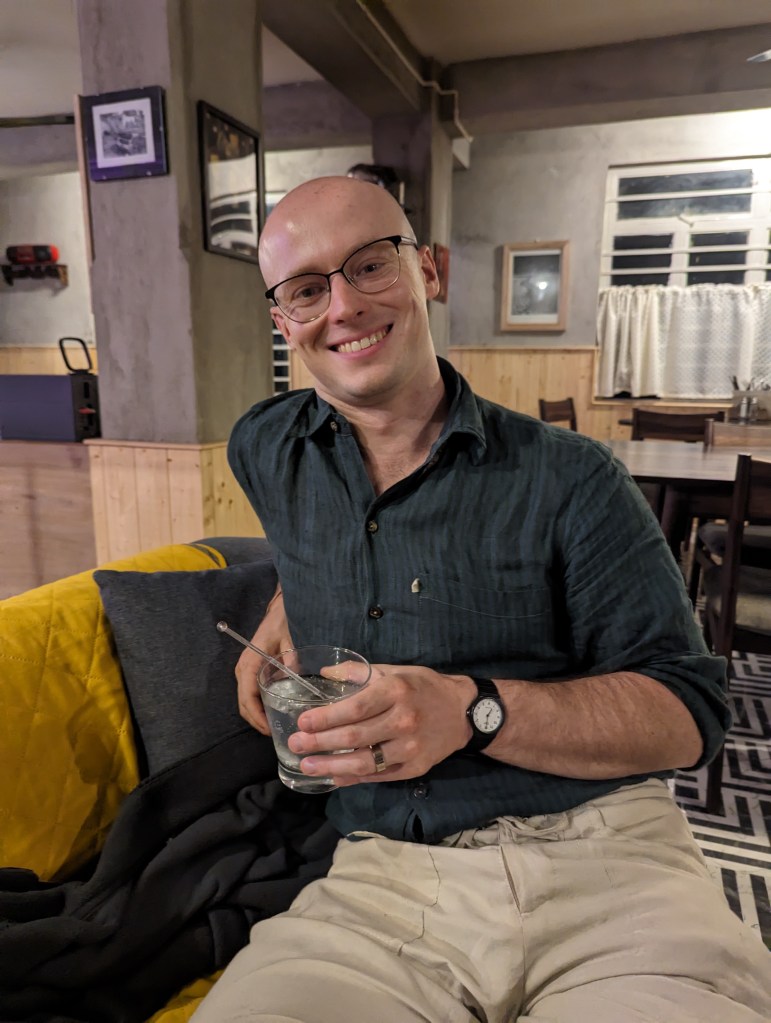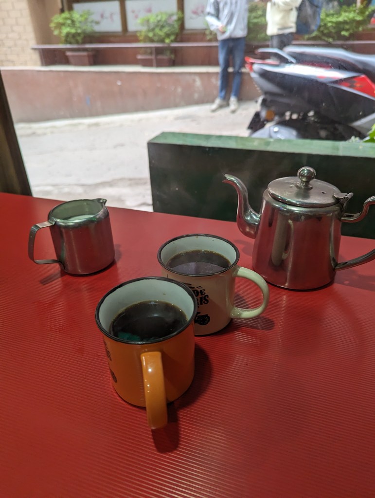 Around dinner time Rob decided he was up for heading out for something plain, and we headed back to our favourite coffee spot which also looked like it had a decent menu. I had their platter of local streetfood-style dishes and was happy to get to try some of them as in Darjeeling we hadn’t really felt up for street food. They included some thick soupy noodles, curried potatoes, bean curd moulded into a kind of firm jelly with a spicy sauce (much better than it sounds I promise) and slightly sweet deep fried dough to dip into the curried dishes.