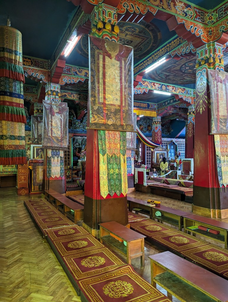 We weren’t shot, and we made our way up towards Durpa monastery. Clearly the military camp had been there for some time, as the soldiers were living side by side with civilians, and amusingly the large army trucks were being used as school buses to take the local children home for lunch as we passed. We arrived at the monastery, which consisted of the meditation hall much like the one we had seen in Darjeeling though with more tourists, and the living quarters for the monks. We wandered around for a while, taking a look into the beautifully decorated meditation hall, and watched some army orienteering exercises going on down on a school field below us, before we descended the hill back towards the city centre.