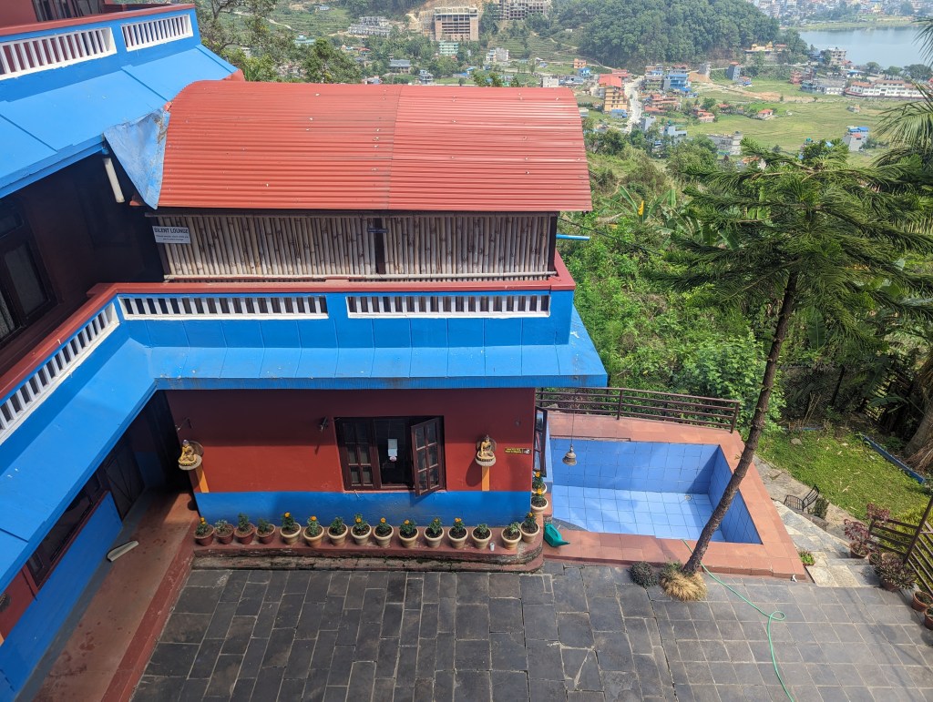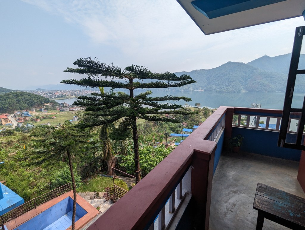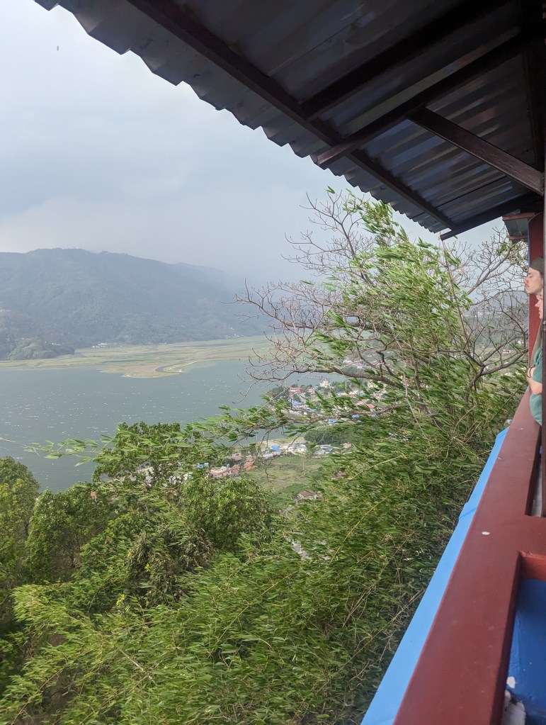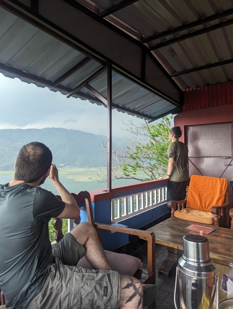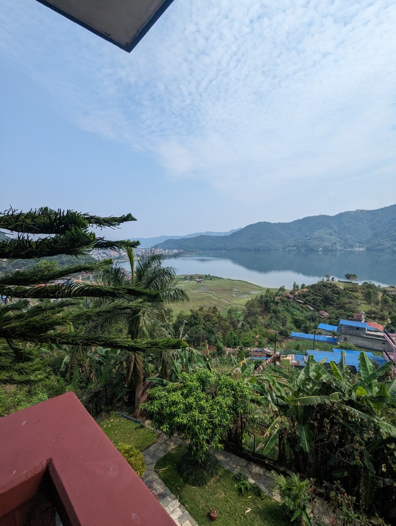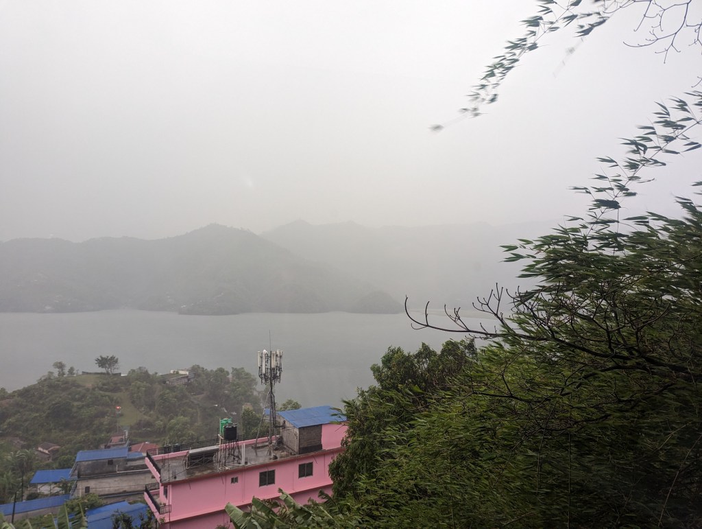 The view from the balcony seating area was absolutely stunning, looking over the vista of Phewa lake and the city of Pokhara at it’s eastern shore. The lake was encircled by tall hills topped by small hill station villages, the Peace Pagoda, and a massive statue of Shiva along its southern bank. Directly below us, was the little village of Pame with its paddy-fields, grazing lands for buffalo and goats, and hotels in various states of construction. As we looked out, a massive thunderstorm blew in with terrific winds and then rain down the valley of the lake from the west, blotting out the sun and rumbling with almost continual thunder.