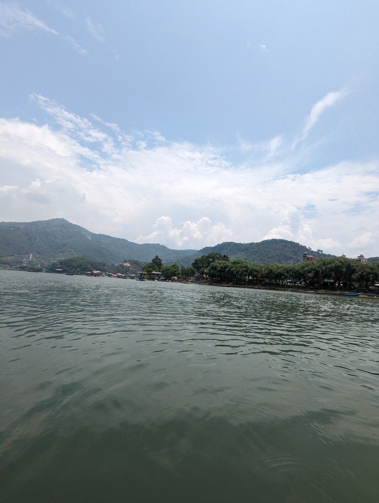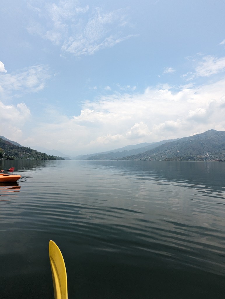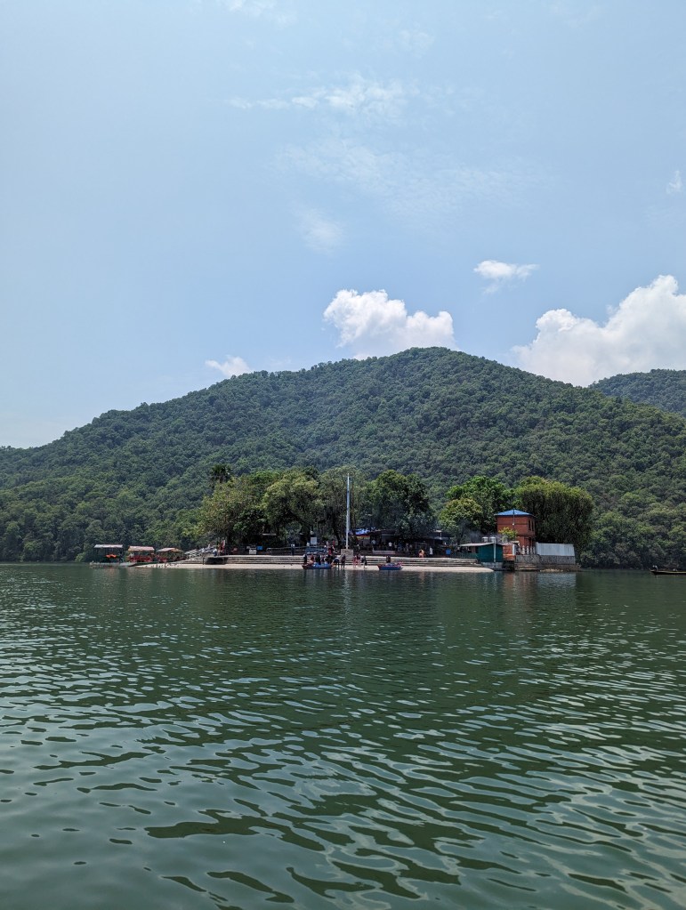 Once we’d finished we headed down to central Lakeside, the tourist centre of the city and a twenty minute walk from where we were in east Lakeside, to hire some kayaks to explore Phewa lake from the water. Kayak rental was quick, cheap, and easy and before we knew it we were out on a pair of old flat-bottomed kayaks paddling around. At the city end of the lake there is a small island built up into a Hindu temple, so we circled this for a look (though it looked more like a cafe than a temple) then set out across the bredth of the lake from south to north.