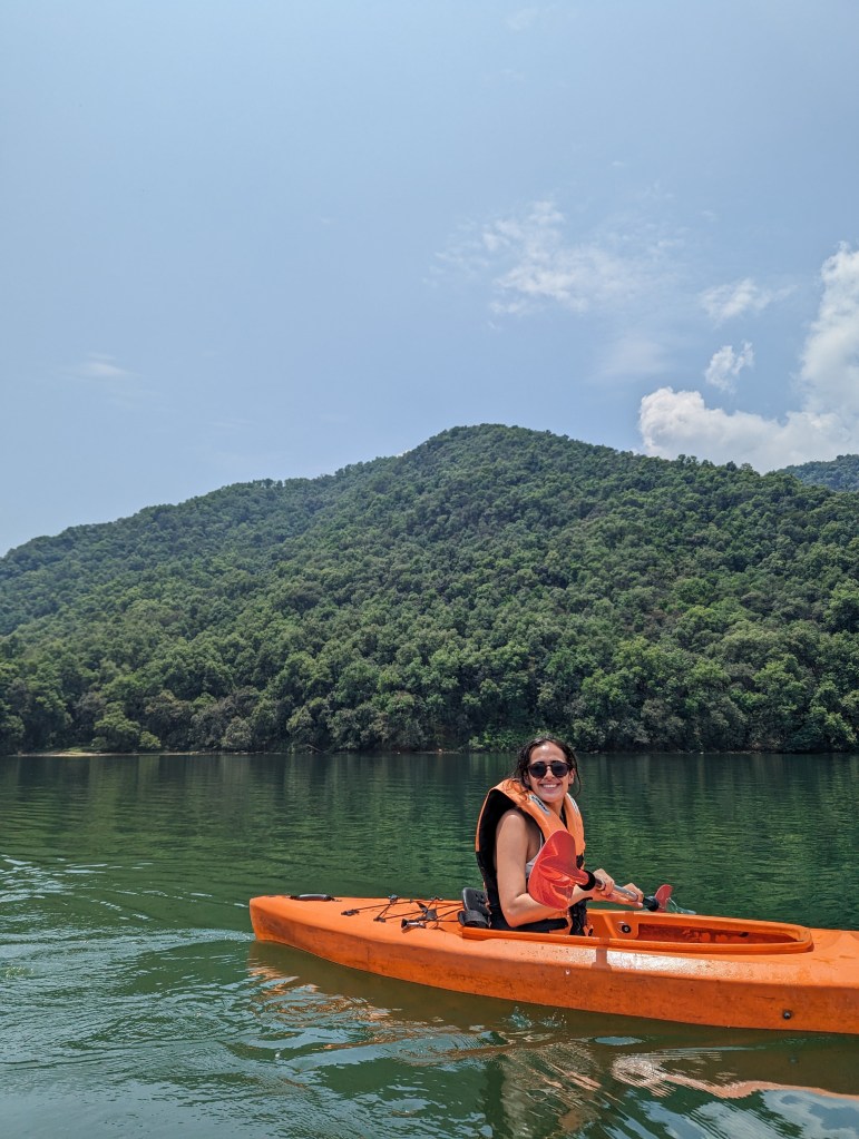 We paddled right up to the village of Pame on the northern edge of the lake, and could see Sadhana Retreat sitting up on the hillside above. It was strange experience sitting on the water in a boat when we had spent so many hours watching boats in the same stretch of water from our vantage point in Sadhana’s rooftop balcony. From here, we made our slow way along the bank back round to central Lakeside to drop off the kayaks and get a quick lunch from a cafe on the lakeside.