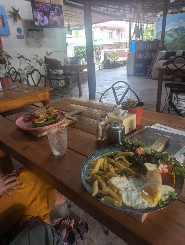 After breakfast, we went back to the hotel for an extended period of blog writing and otherwise hanging around catching up on all the admin and replying that accumulates after even a week without using your mobile phone. It was mid-afternoon by the time we had finished with this, and we were ready for something else to eat. We popped back out to another of almost literally countless relaxed little cafes and eateries between us and central Lakeside for a very late lunch which was a slightly disappointing combination of relatively plain pasta and an overcooked egg, then came back to the hotel to read in the outdoor space and get a bit of tutoring done.