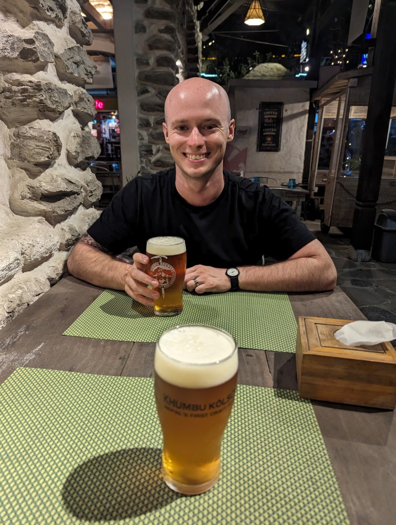 By the evening we were ready to get back out, and I had spied somewhere that did beer by the pint. Neither of us have had a pint since leaving the UK, and the Nepalese craft beer on tap was surprisingly good. We sat out in the restaurant patio on the side of the Lakeside promenade and watched the crowds of Western, Nepali, and Indian tourists go pass, before joining their ranks to walk further into central Lakeside.