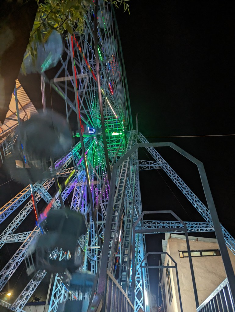 From the Movie Garden we had seen a ferris wheel on the side of the lake that seemed to go unecessarily fast, and so I had convinced Ellie that we should go seek it out. The ferris wheel was actually part of the larger “Disneyland Pokhara”, which was a collection of rusted, creaking, old funfair rides stalked by staff wearing nightmarish and slightly dirty full-body panda suits. Despite the dystopian first impressions, it was surprisingly busy still at 10pm with Nepali kids and the occasional tourist group. We bought our ticket and headed straight for the ferris wheel.