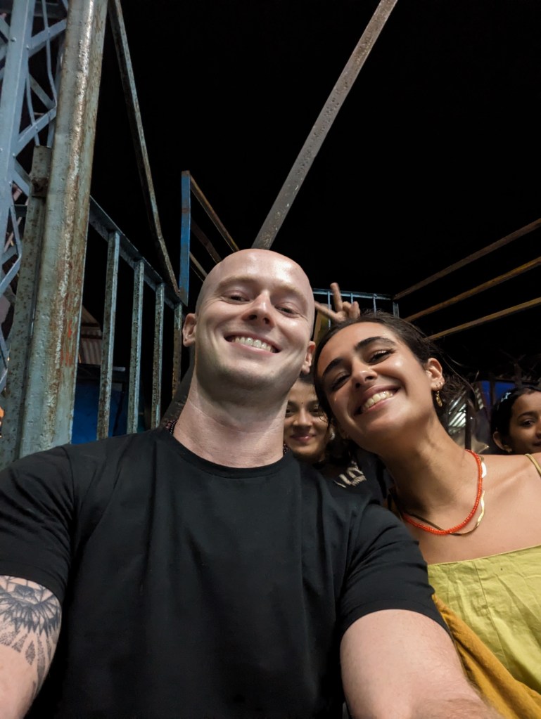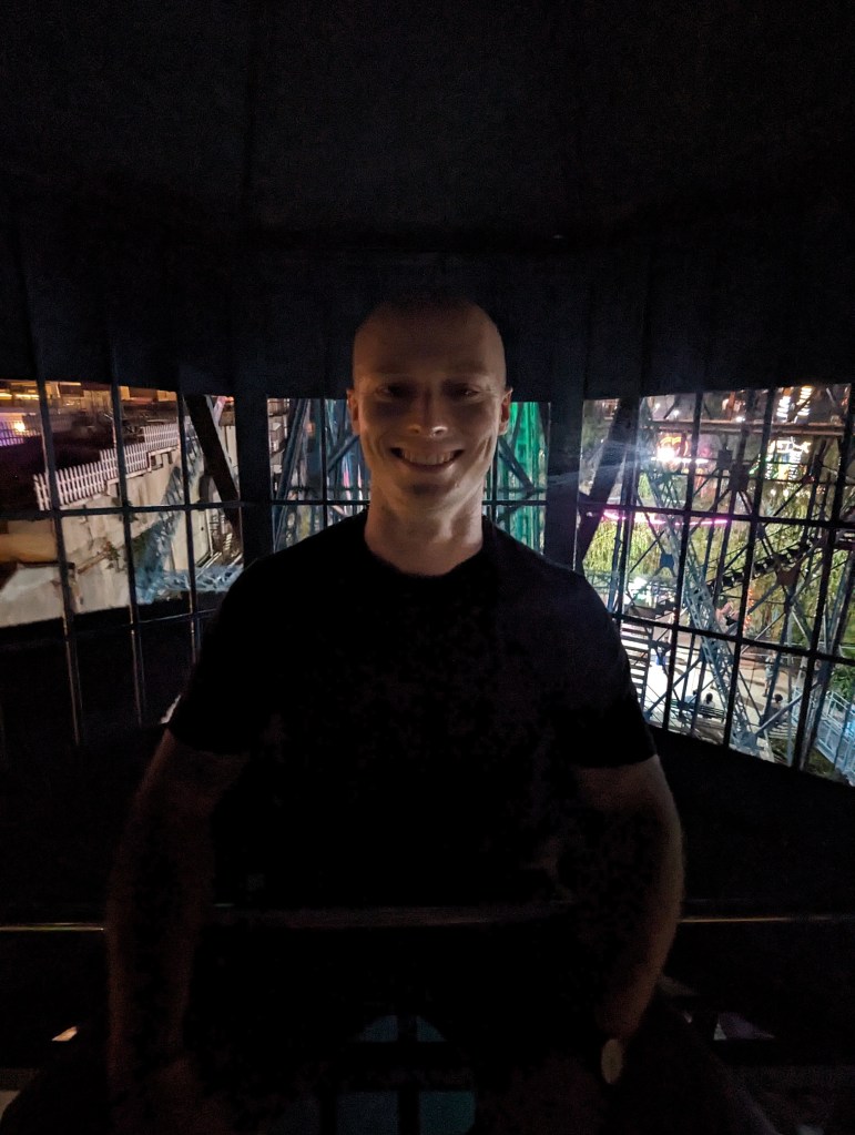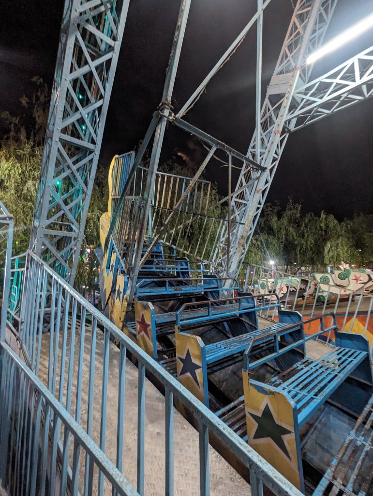 You might think this wouldn’t be an enjoyable experience, but the mild thrill combined with the amusement of how rickety the whole operation was made for quite a fun time. We queued back up for a ticket for another ride – this one was one of those ships that swing like a pendulum backwards and forwards until, at the apex, you’re perpendicular to the ground. We got on with a family of four, the youngest daughter of which was absolutely fascinated with Ellie in particular. The ride was operated by the same rod-in-hole crank mechanism by an even younger looking man, and the moving parts made an extraordinary creaking as the ship started swinging back and forth.
