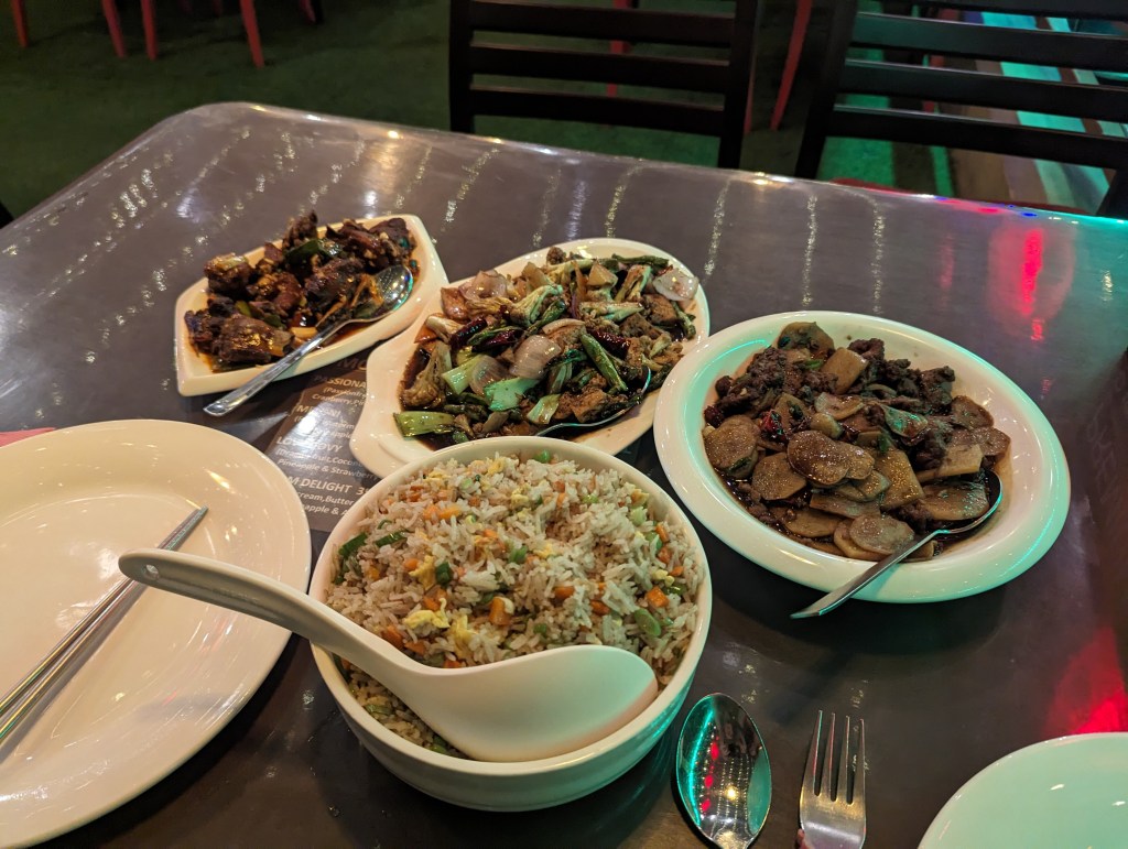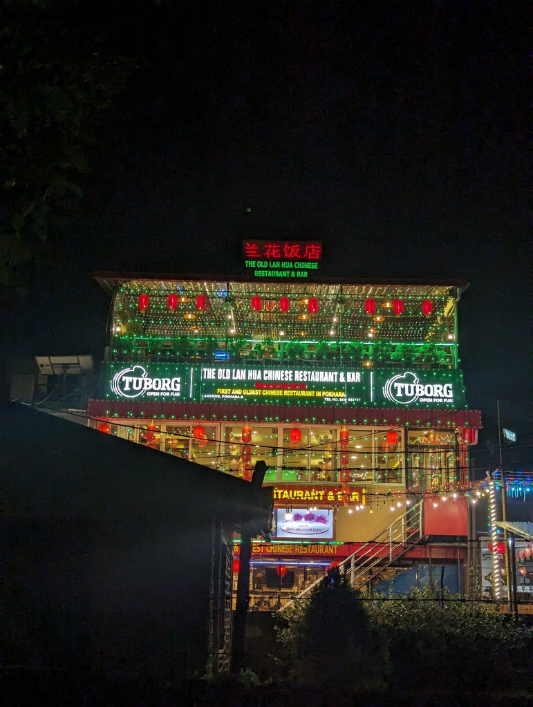 We hobbled out home to shower the long day off with record speed as we were both starving and headed for a well-reviewed Chinese claiming to be the first in Pokhara. The outside looked absolutely unhinged and we were struck by the fact the prices were pretty high for Nepal (we’re talking around £5 for a meat main), but when the food arrived we realised that was because one dish could serve 2-3 people.Luckily we were hungry enough to make a valiant effort, and enjoyed taking out time over it next to a table of robed Buddhist monks clearly on their permitted night out of the monastery, hardly concealing our fascination with what they would order (lots of steamed veg and some orange squashes if anyone shares this interest).They packaged up the leftovers for us which our friends back at Nanohana Lodge stored in the reception fridge, and we headed home happily exhausted.