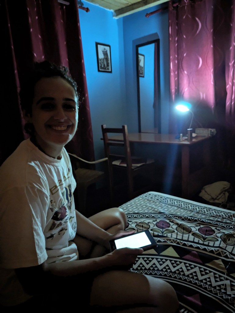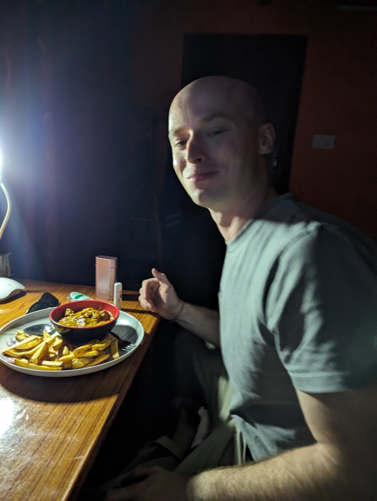 Predictably, this immediately knocked out the power (the electricity cables in Nepal are in a state of disarray and often telegraph poles have uncountable numbers of wires wrapped around them and buzz ominously), so Prem came up with a battery lamp for the room. Before long, he returned with our dinner and a big bottle of Nepali Ice beer, which we split between us. It was a pretty delightful meal, sitting with the light of the lamp and near constant lightning, listening to the thunder and rattling roof above us, and enjoying Prem’s curry and massive portion of chips. Once we’d eaten, there was nothing else to do than to read on the bed until it was time to get some sleep in preparation for the next leg of the hike in the morning.