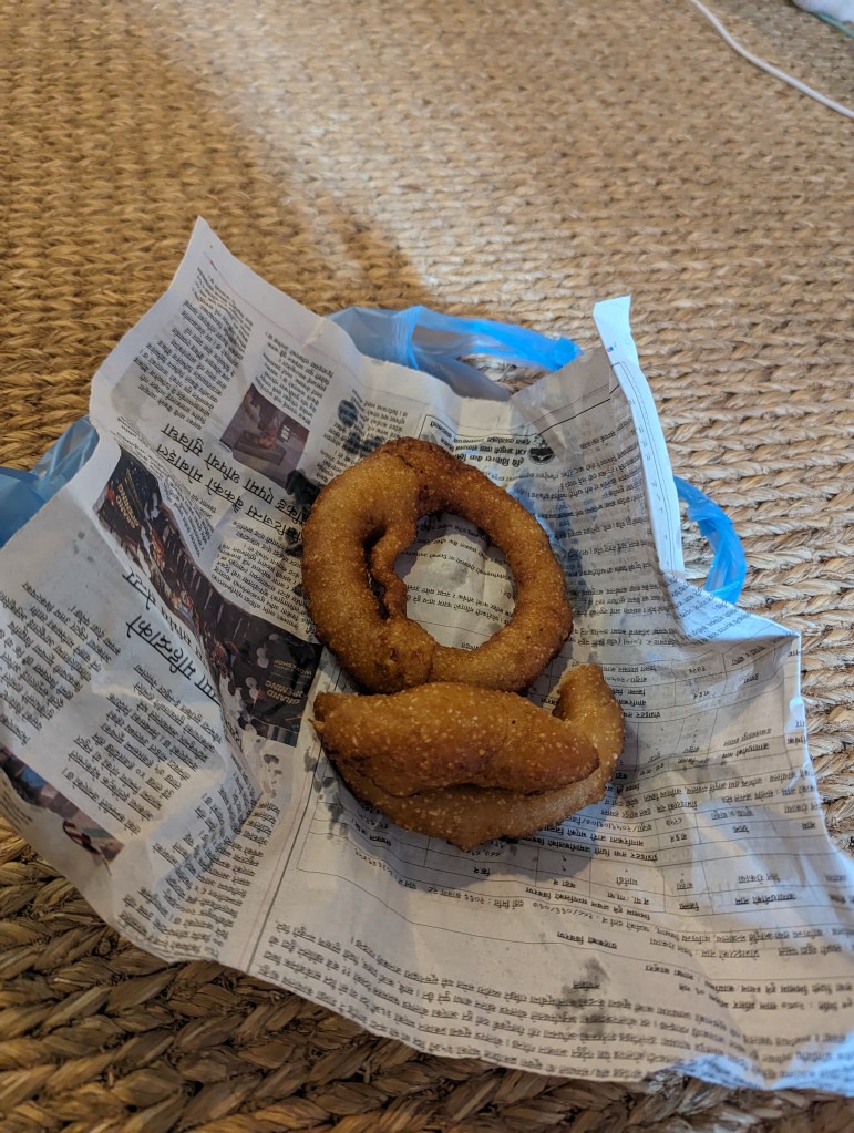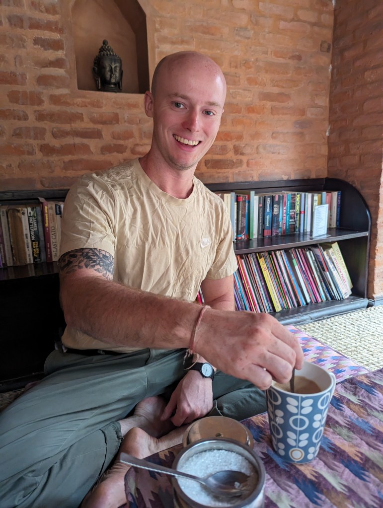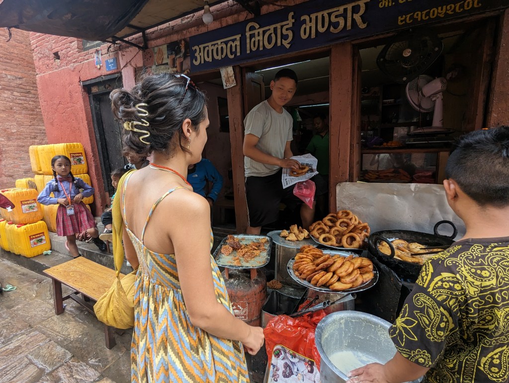 We had chosen our breakfast the night before at Newa Chen, and when we came downstairs were shown to a little low table with cushions to sit on in the hotel’s garden. We were the only guests for the first two nights, and the hotel had a slight air (as so many places have had) of not being busy enough to get into the swing of things, though it was still very pleasant. The rain started to fall softly as we sat drinking our chai and eating lentil bread, but soon cleared up enough for us to head out to a local coffee shop as the first stop of the day. On the way, we passed a stall just outside our hotel selling sel roti, a slightly sweet dough ring made of deep fried rice flour, and which transpire to be very, very moorish.