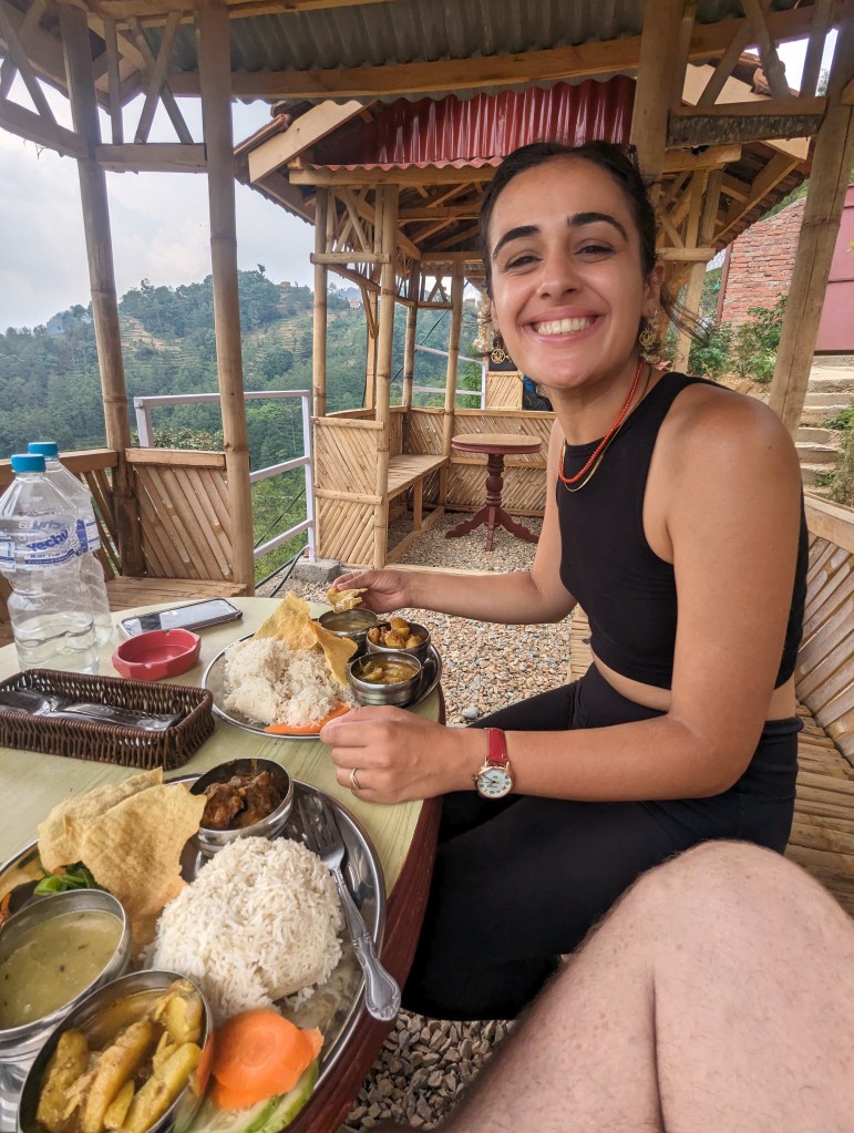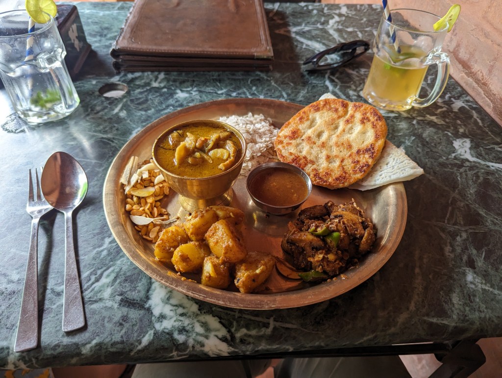 The restobar was relatively busy with Nepali men for somewhere so out of the way, and had a lovely outside area with a stunning view. We ordered our Nepali thalis, and waited for our food to come. After 45 minutes, we were still waiting for the food to come. After an hour, we were still waiting for the food to come, and watching enviously as the guard dog was fed rice from his bowl. About this time, the chef who was also the owner came down to check our order (an ominous sign), but only a few minutes later came down again with the food.