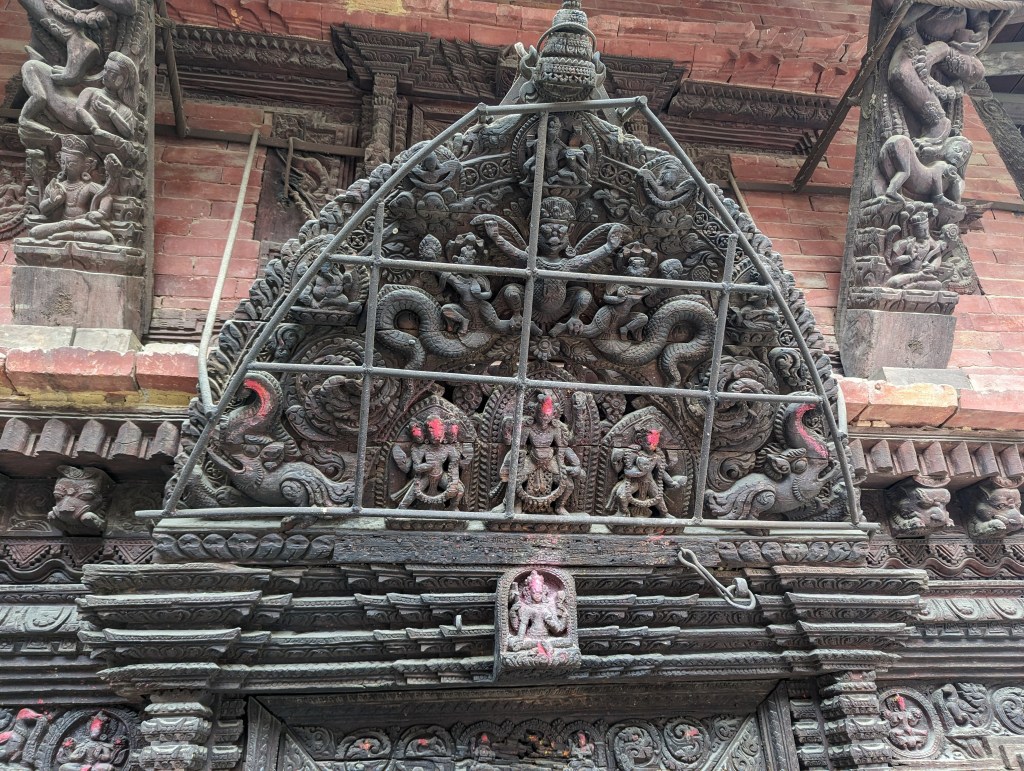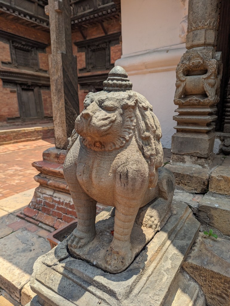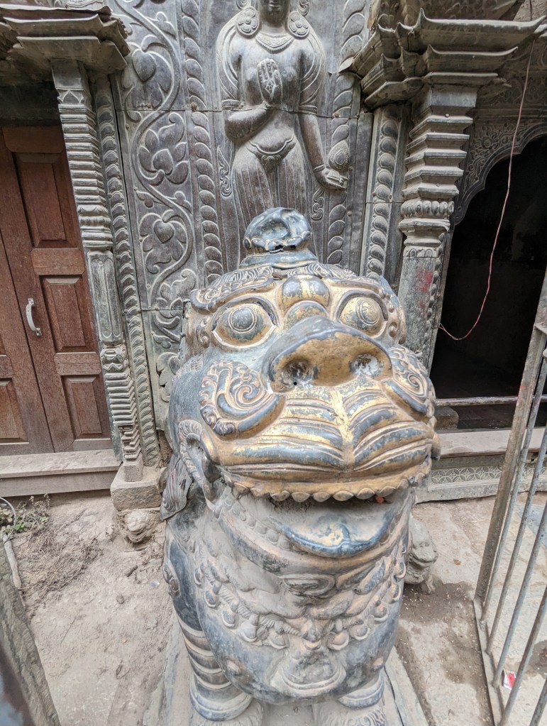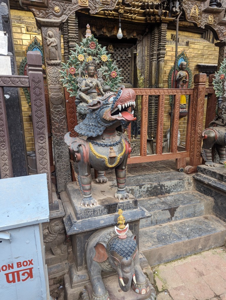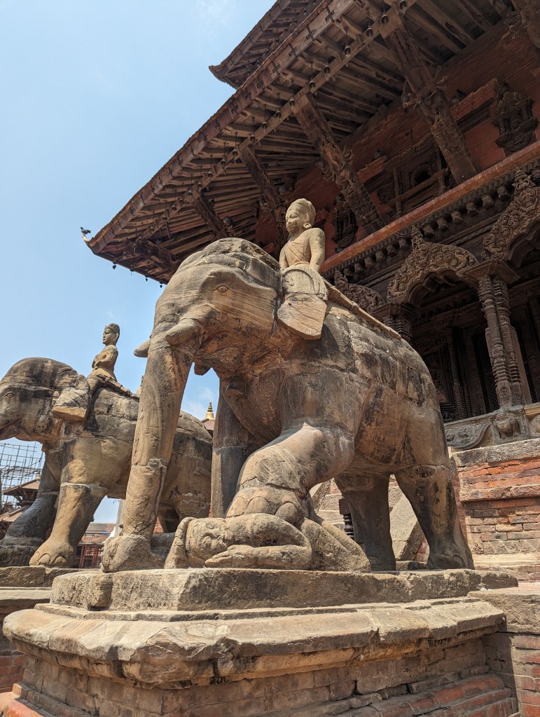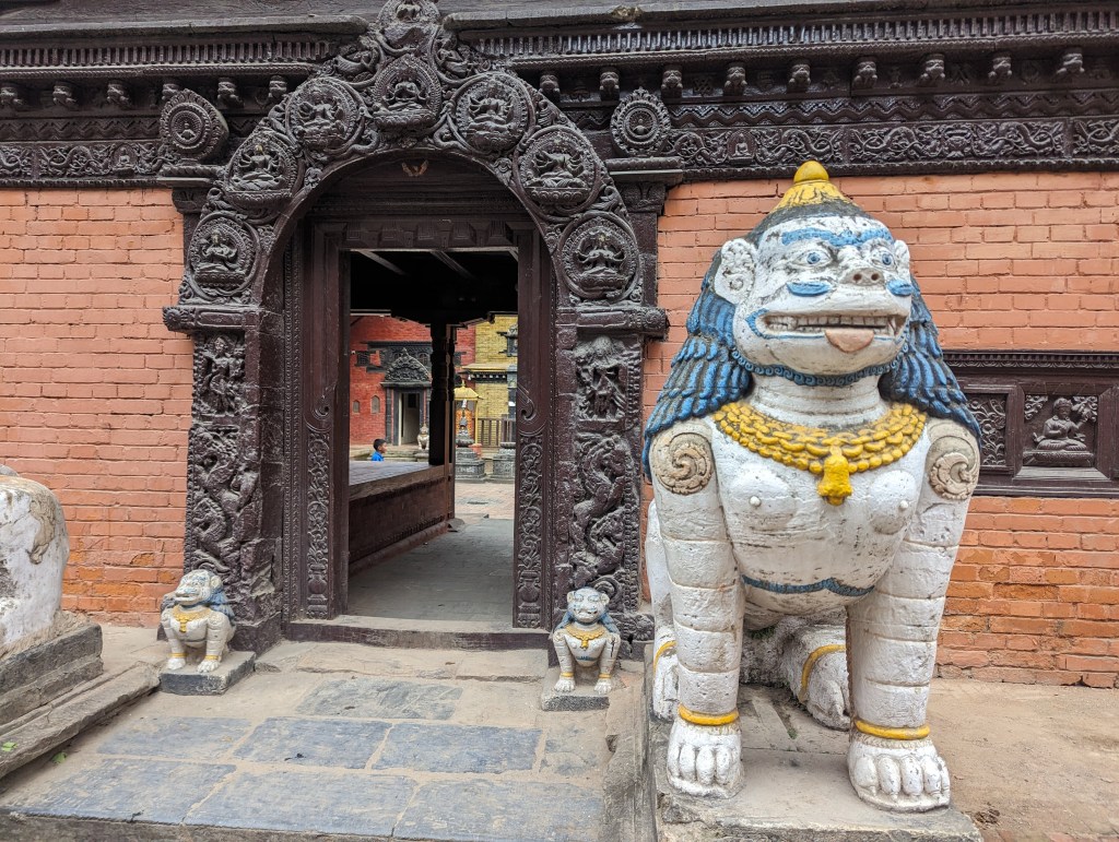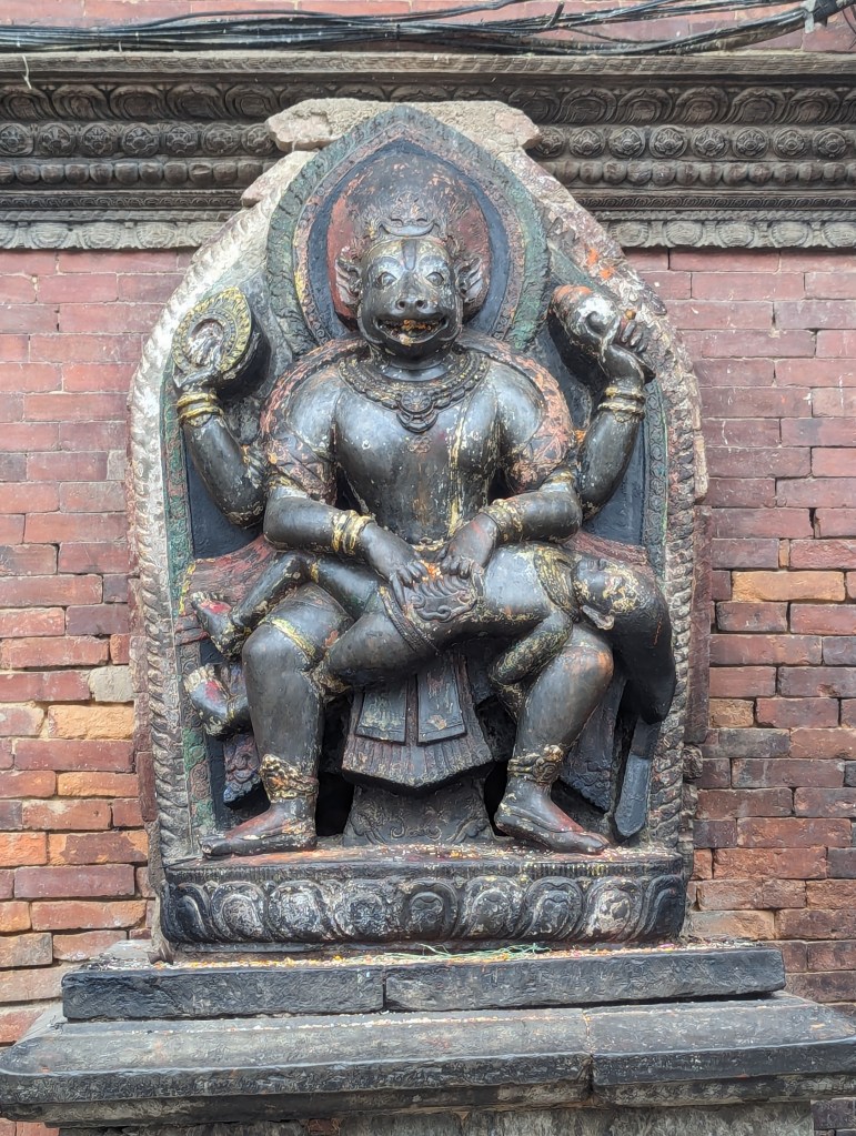 After paying our entry fee to the square and donning the required embarrassingly obvious tourist permits around our necks, we set off looking around the many little temples in the centre. Most could only be viewed from the outside – including templates dedicated to Shiva, Vishnu and Krisha with their respective mounts (animals who loyally carry each God) waiting outside. We were notably allowed to enter a temple in which an idol of the ‘muscleman’ God depicted as sitting on an enemy which was somewhat entertaining, unfortunately we weren’t allowed to take any snaps of him. Some of the temples in the area were still in the process of being rebuilt after the 2015 earthquake, which practically flattened the entire square.