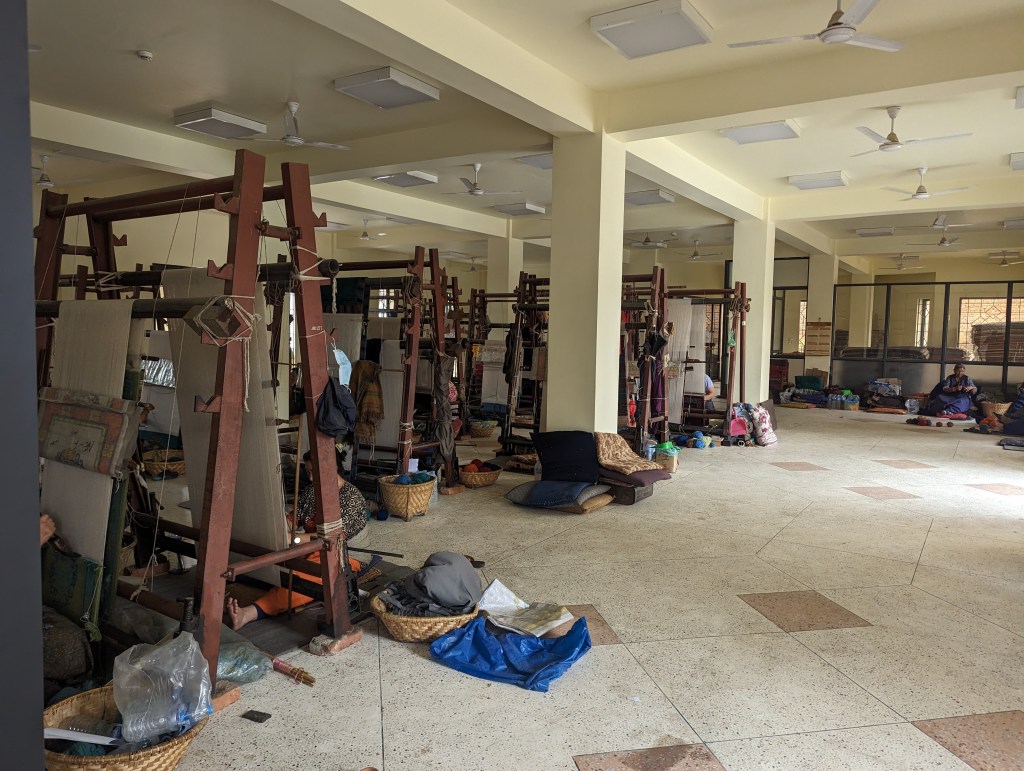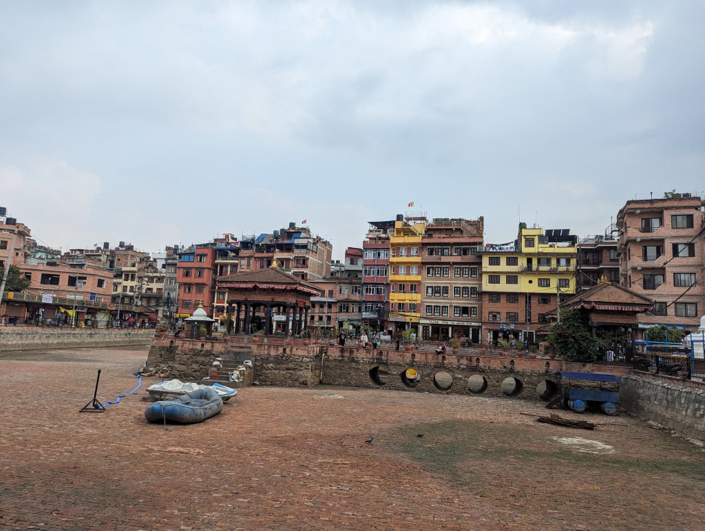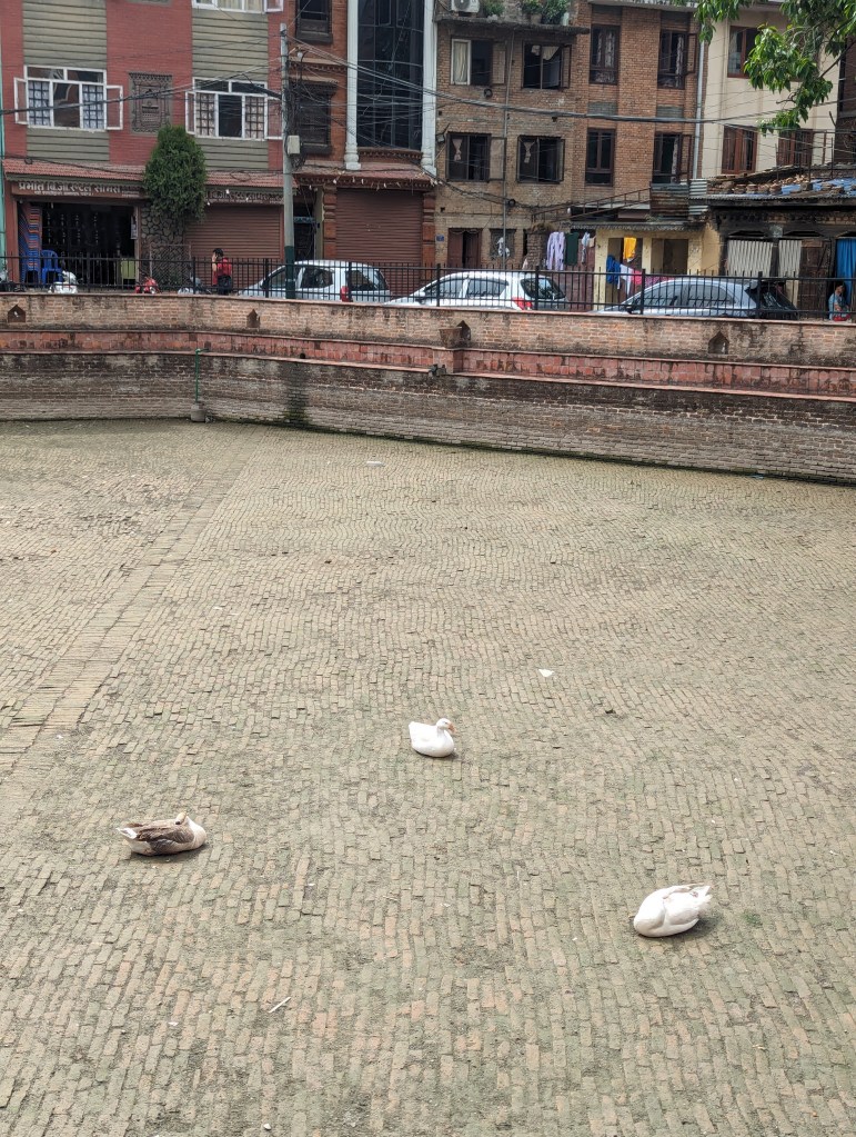 Our walk took us past one of the man-made ponds in the city which, despite the recent rains, was empty of water. A few confused looking geese still sat at the bottom looking distinctly uncomfortable and waiting for the coming monsoon. We detoured from the route at this point, and took a walk through the more residential and commercial areas of Lalitpur to reach the Jawalakhel Handicraft centre, where Tibetan rugs and other handicrafts were made by the Tibetan diaspora in Kathmandu. In the main hall, at least twenty old Tibetan women were sat on the floor in front of giant looms (though they’re probably not actually technically looms) making thick Tibetan carpets. As much as we would have liked to get one, it was unlikely we’d fit a rug in our hold luggage, so we settled for buying an ornament for our first Christmas tree, and walked back towards Patan.